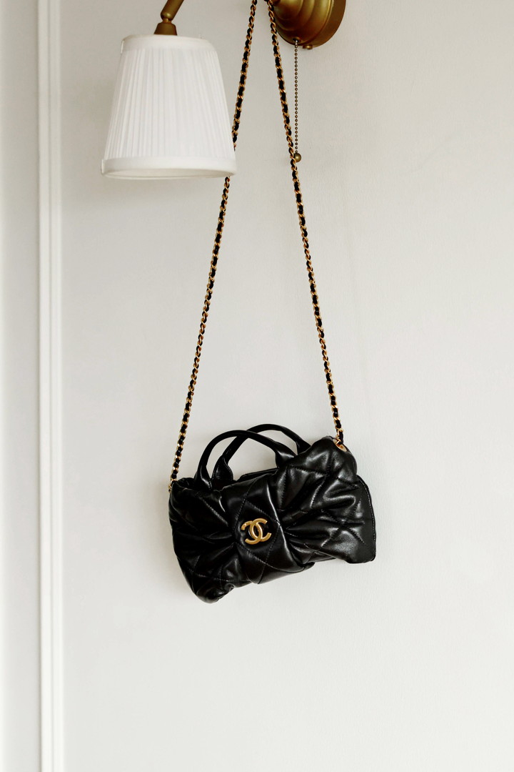 艶やかなブラックラムスキンで仕立てられた《シャネル》の新作ミニバッグ。インターレースチェーンをあしらった、ボウシェイプのフォルムがなんともチャーミング。甘さの奥にモダンなエッセンスを秘めたデザインは、レディの心をくすぐる。世界中のファッショニスタを魅了する、今季注目のハンドバッグ。