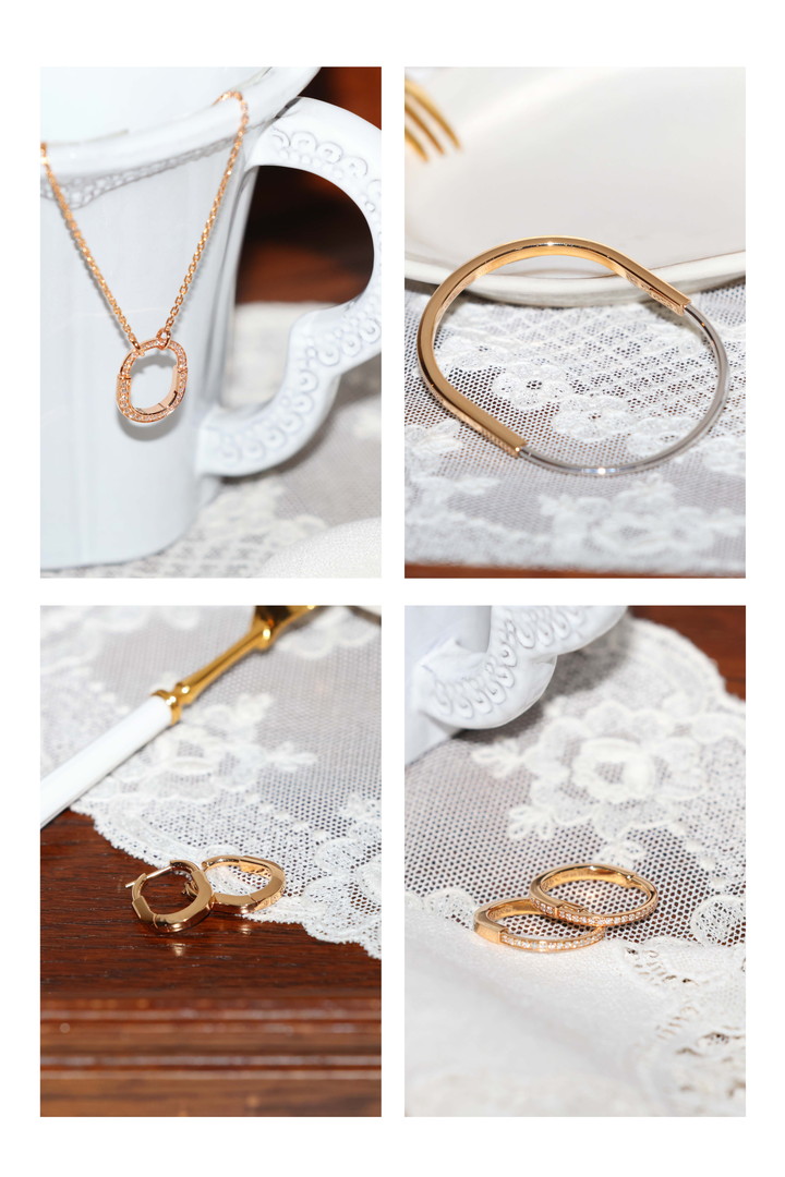 右上_バングル[18KRG×18KWG] ¥792000 左下_ピアス[18KRG] ¥577500 右下_(上)リング[18KRG×DIA] ¥1028500