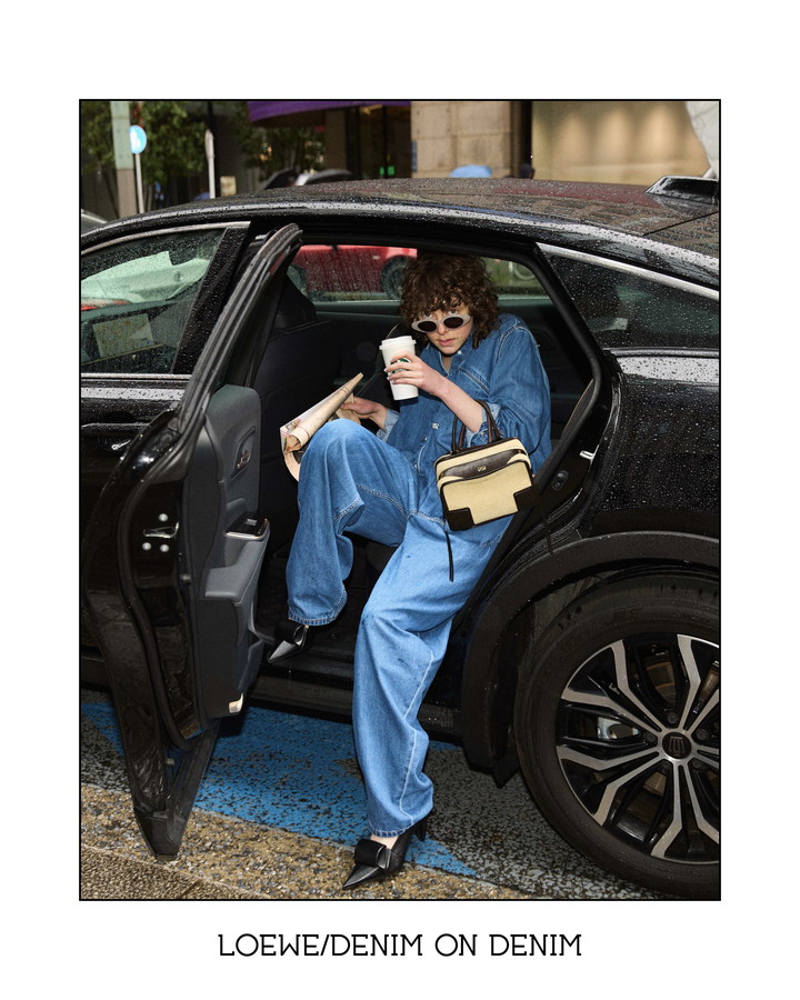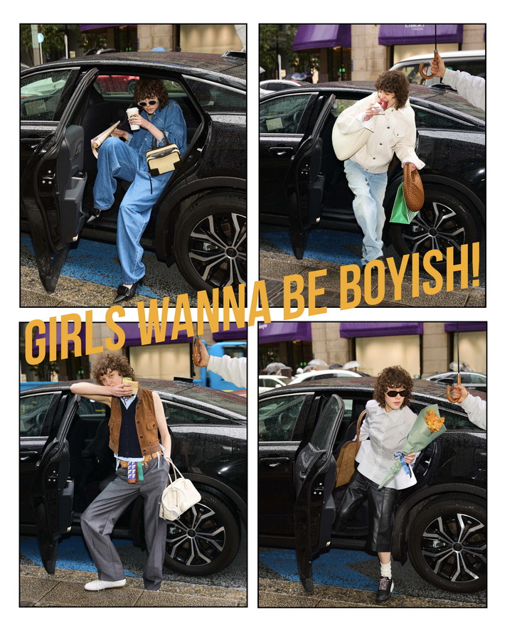 真っ白なレザーで仕立てたトラッカージャケットは《ボッテガ・ヴェネタ》。首の後ろに配したイントレチャートのストラップデザインがポイント。ルーズフィットのブルーデニムを穿いて、とことんボーイッシュに。
