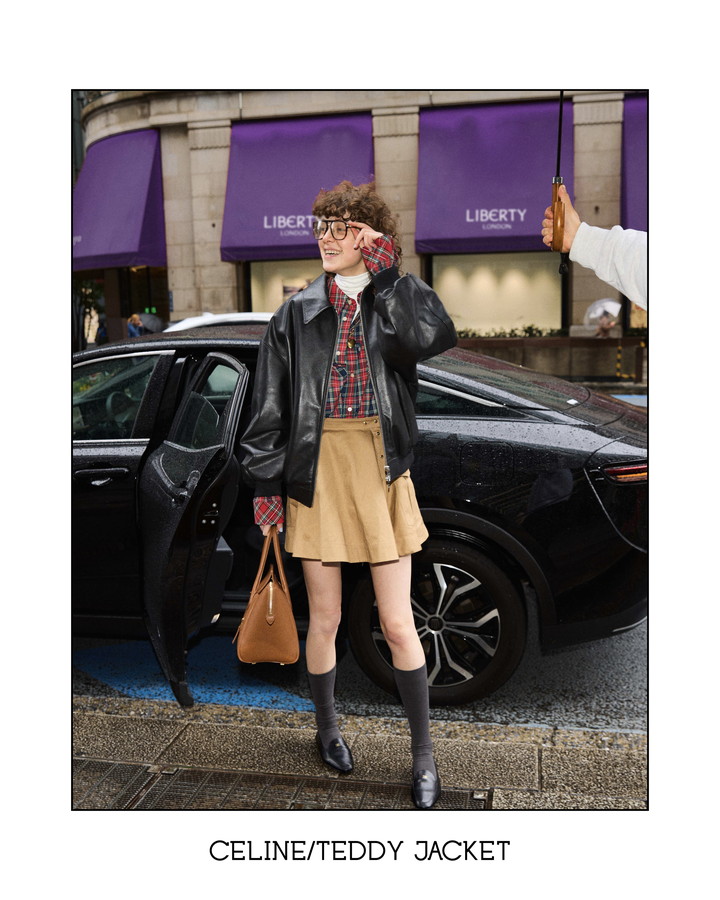 滑らかなカーフスキンのテディジャケットは、ボーイフレンドから借りたようなルーズなフィット感が素敵。タータンチェックシャツに、ミニスカートを合わせたトラッドな着崩し方も真似したい。