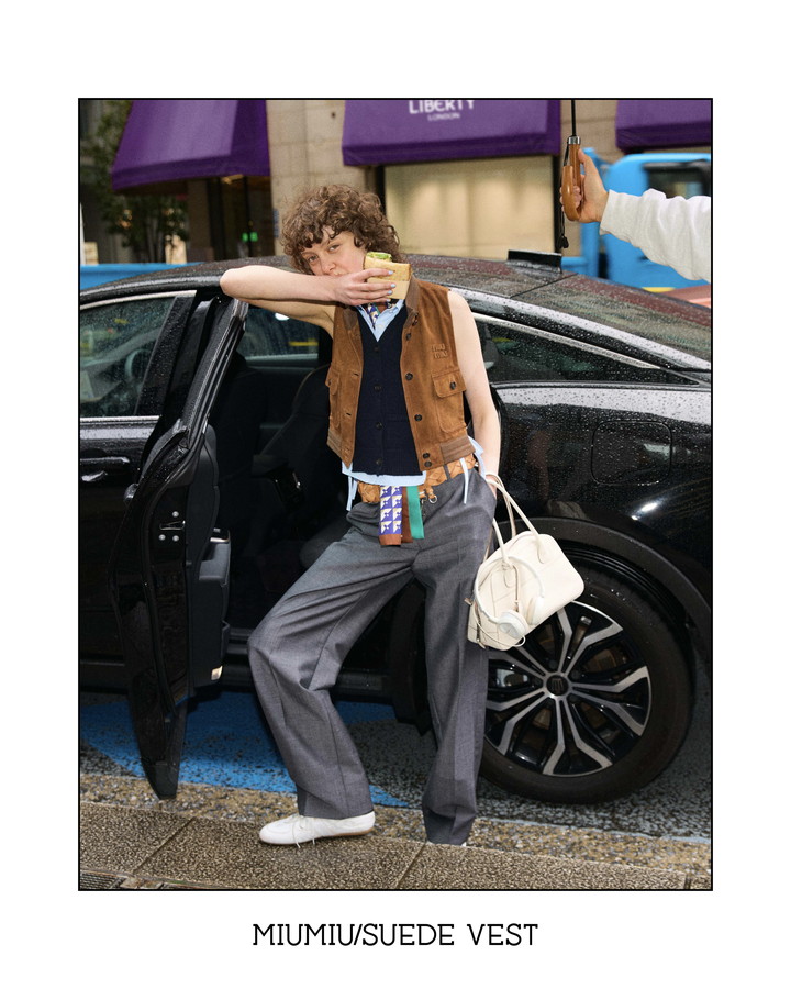 ブルゾンの袖をカットオフしたようなデザインのスエードベスト。思いっきり腕を出したスタイルも、上品に見えるのはトラウザーを合わせているから。真っ白なシューズやバッグで、クリーンにまとめて。