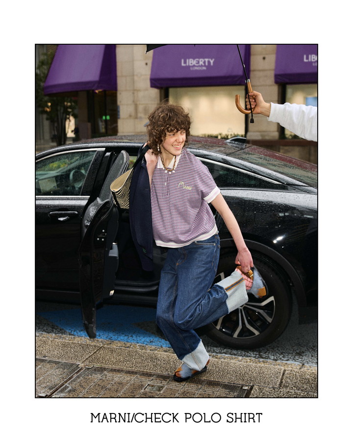 ワイドシルエットのチェック柄ポロシャツ。程よくルーズなシルエットと襟と袖口、裾の切り替えがエレガント。ロールアップデザインのデニムパンツを合わせて、ボーイッシュな着こなしを提案。