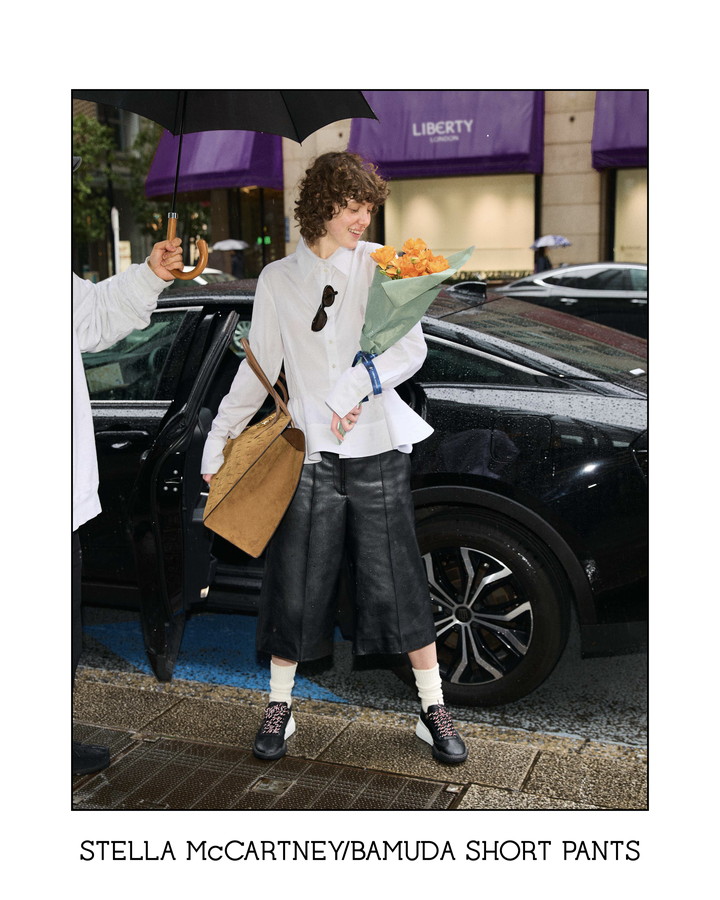 ヴィーガン素材を採用したバミューダパンツ。膝下丈のワイドシルエットは、穿くだけでストリート感漂う着こなし。トップスにペプラムデザインのシャツを合わせることで、コントラストのある着こなしを演出。ボリュームのあるチャンキーソールが特徴のスニーカーも気分だ。