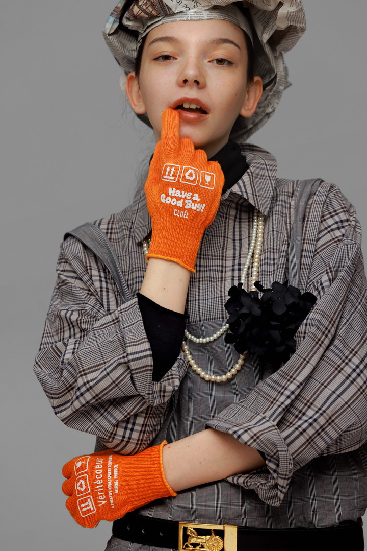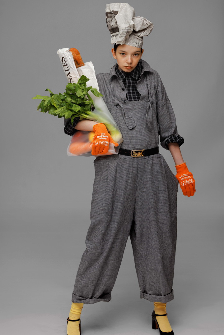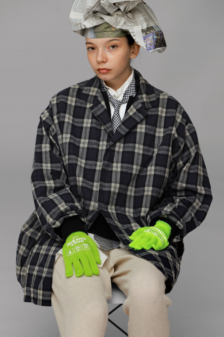 ライトグレーのオーバーオールは、ダークトーンのチェック柄との相性も抜群。パステルカラーのソックスやノベルティの軍手はカラフルなのでアクセントにぴったり。ジャケットをシャツのように着こなすことによって、今まではとは違う表情を生み出してくれる。