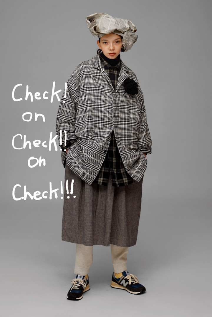 大ぶりなチェック柄がアイコニックなショートコート。ゆったりとしたシルエットだけど、比翼仕立てですっきりみせるディテールがポイント。千鳥柄のワンピースと黒のニットでトーンを揃えれば、シックな印象にまとまってくれる。小ぶりなテーラードカラーが、日常の上品なアクセントに。