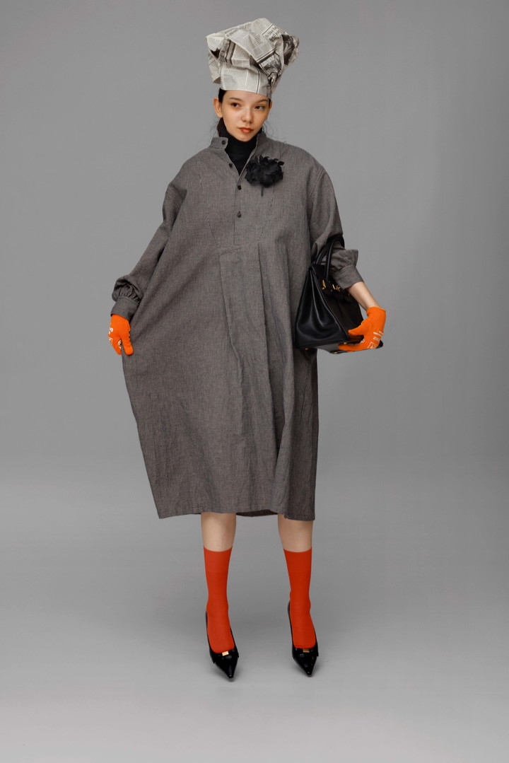 フロントの胸当てや、狭めに設定された後ろヨーク切り替えが、ヴィンテージのドレスシャツを思わせるワンピース。ワッシャー仕上げによるほど良いゆとりが、動くたびにシルエットを変え、洗練された印象を生み出してくれる。リネン特有の着心地の良さもデイリー使いにぴったり。