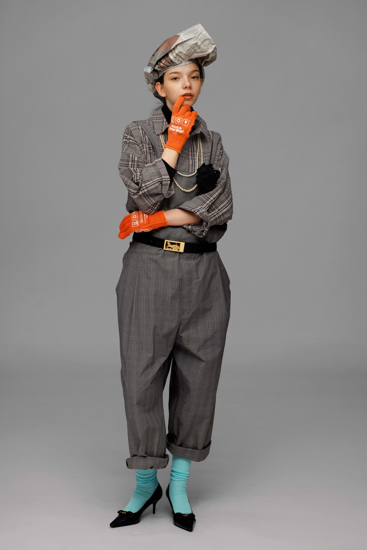 本来カジュアルなオーバーオールに、上品なチェック柄を落とし込んだ一枚。大好きなチェック柄で遊ぶなら、ちょっと大胆なくらいがちょうどいい。チェックにチェックを重ねて、クラシックな柄にポップな小物をひと匙。レディジェントルスタイルの完成。