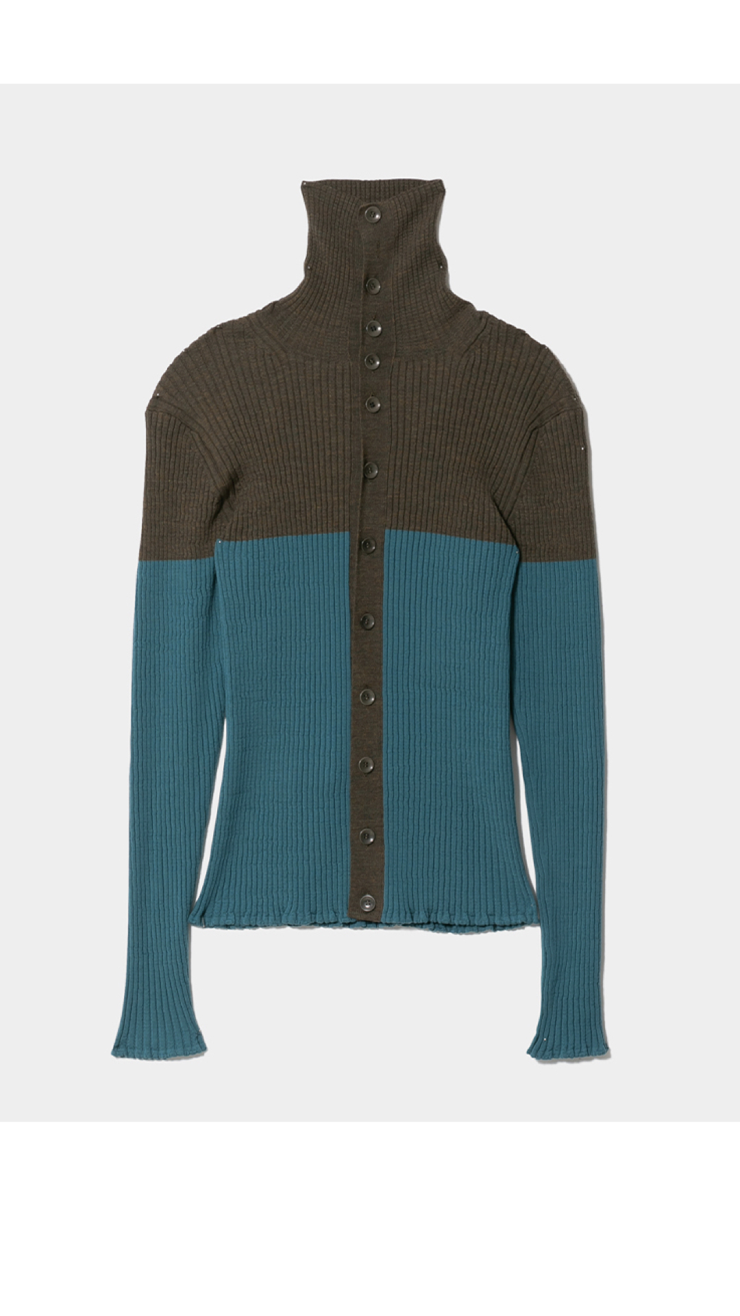 カーディガンとスクエアネック、一着で2つの表情を見せてくれるバイカラーニット。繊細で柔らかいウールを使用しており、毛羽感がなく清涼感と光沢感のある風合いが特徴。