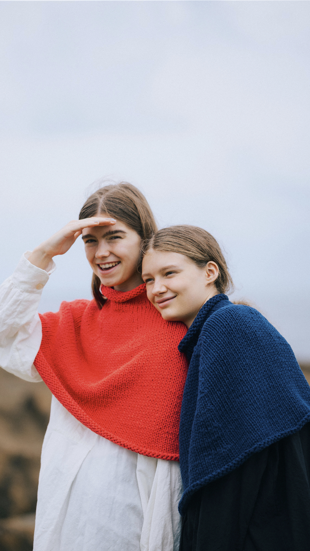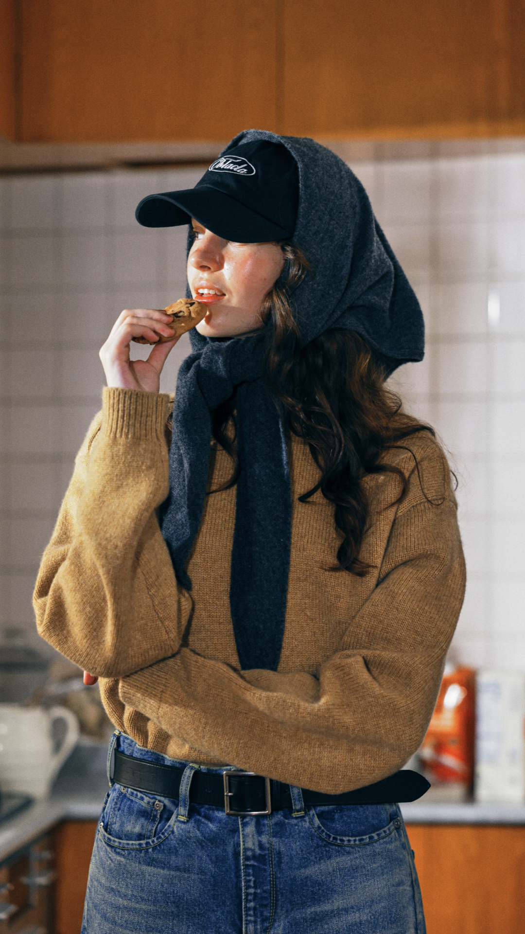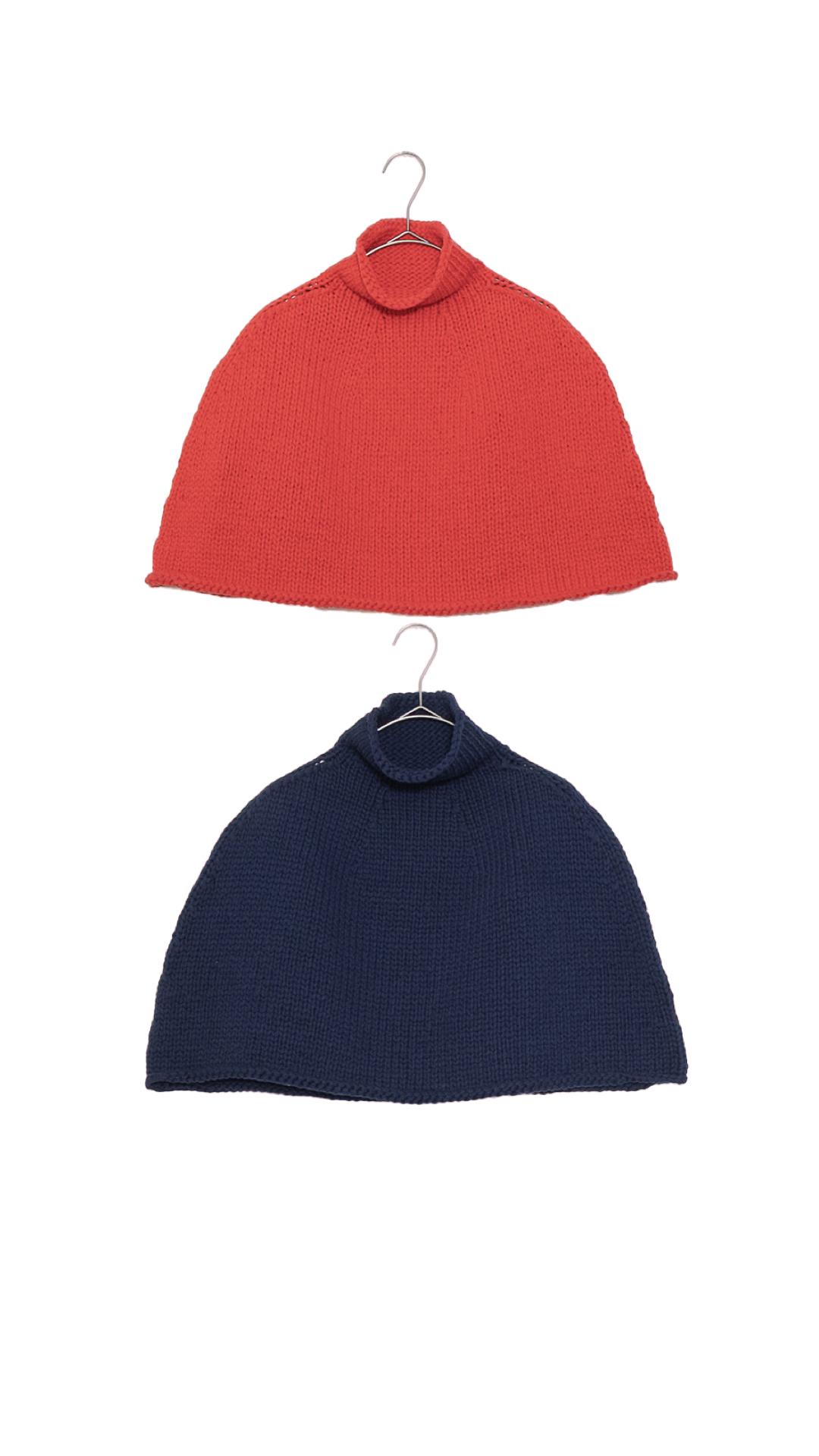 編み目の存在感を活かして立体的なシルエットを実現した、《ヴェリテクール》のニットポンチョ。個性的なレイヤードスタイルを実現して、着こなしのアクセントに。