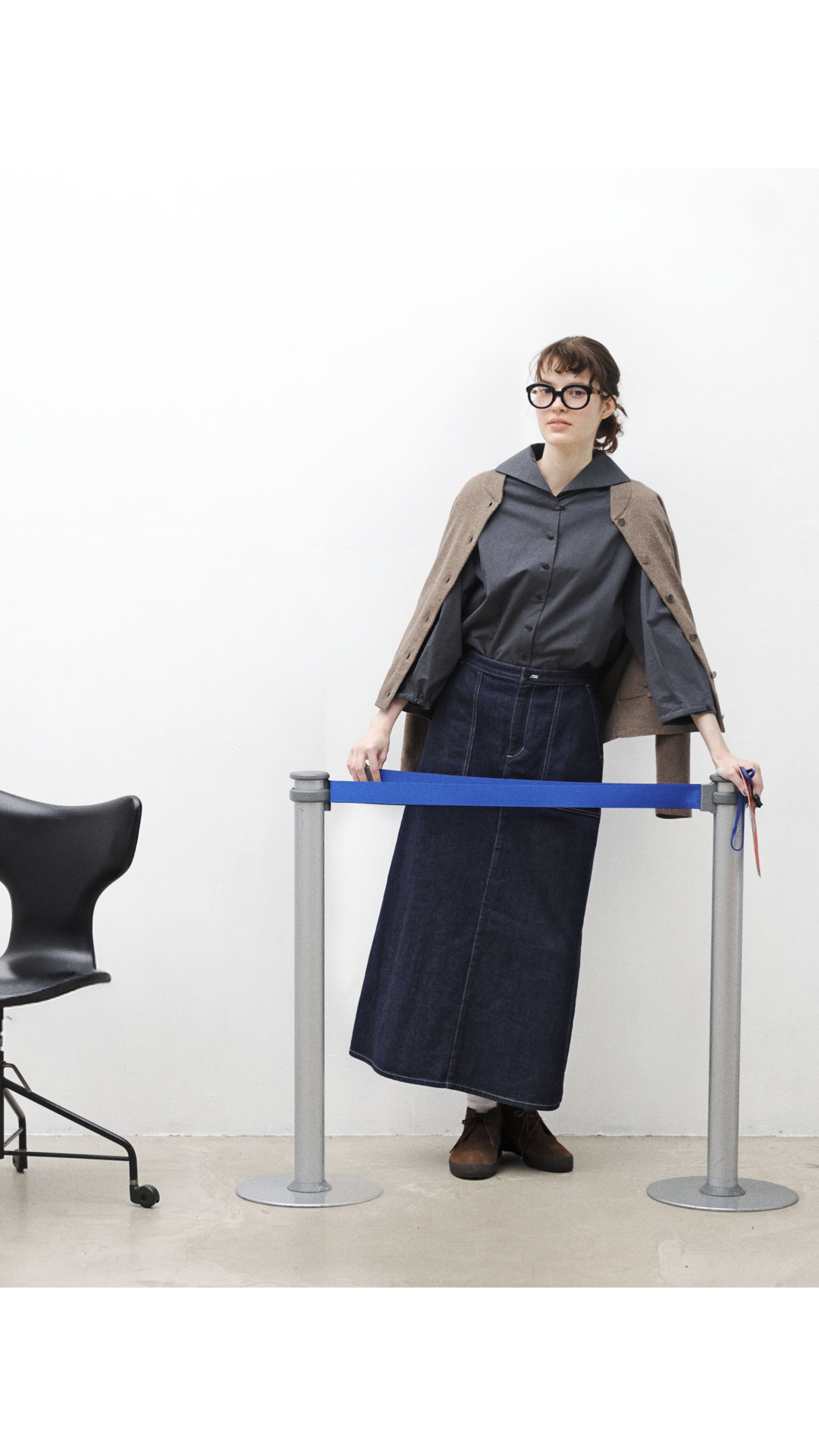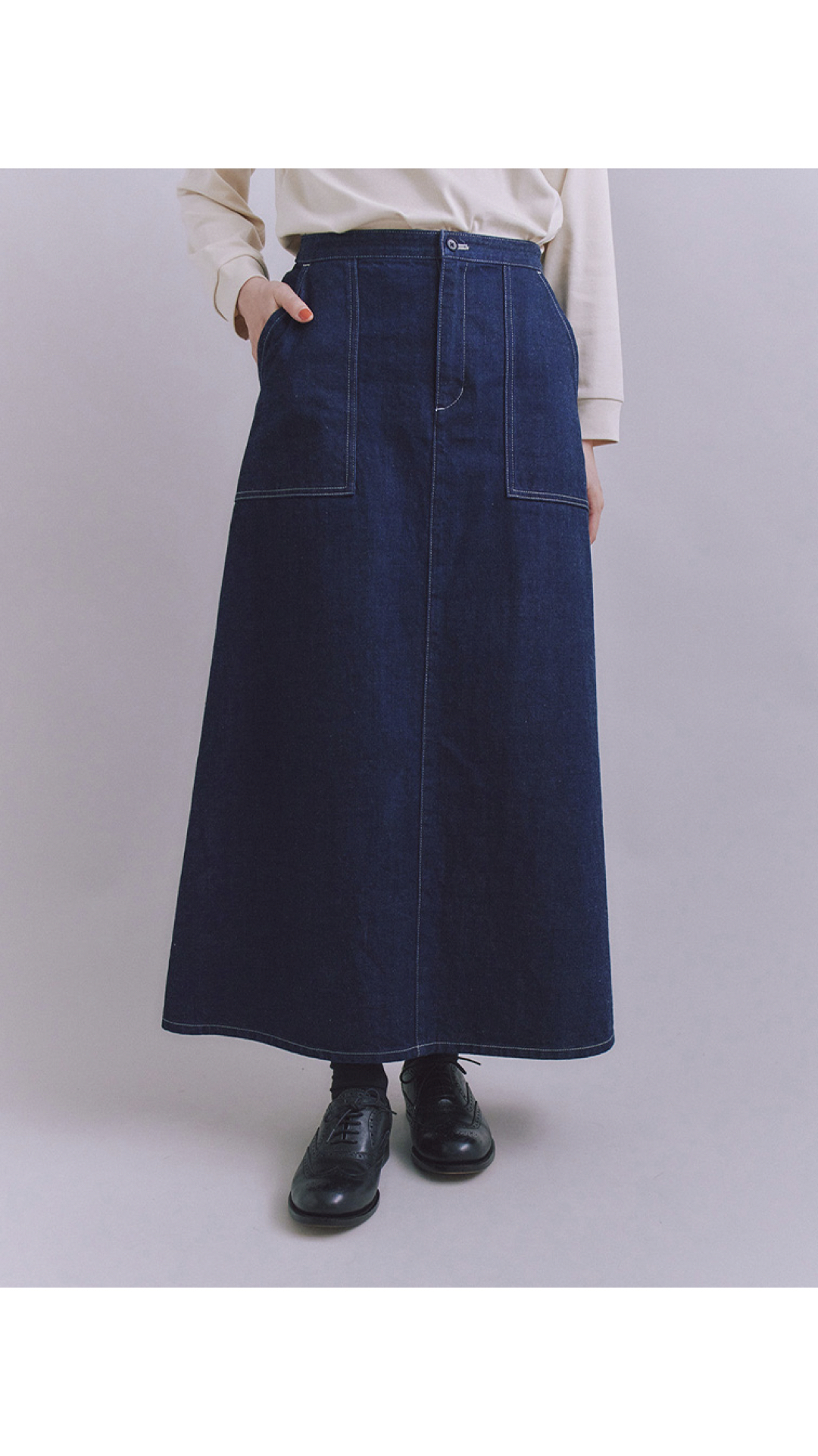 Aラインのロングスカートは、《シプリ》定番のベイカーパンツのパッチポケットの仕様を加え、さりげなく個性的な雰囲気に。ウエストのアジャスターボタンでサイズ調整が可能なのも嬉しいポイント。