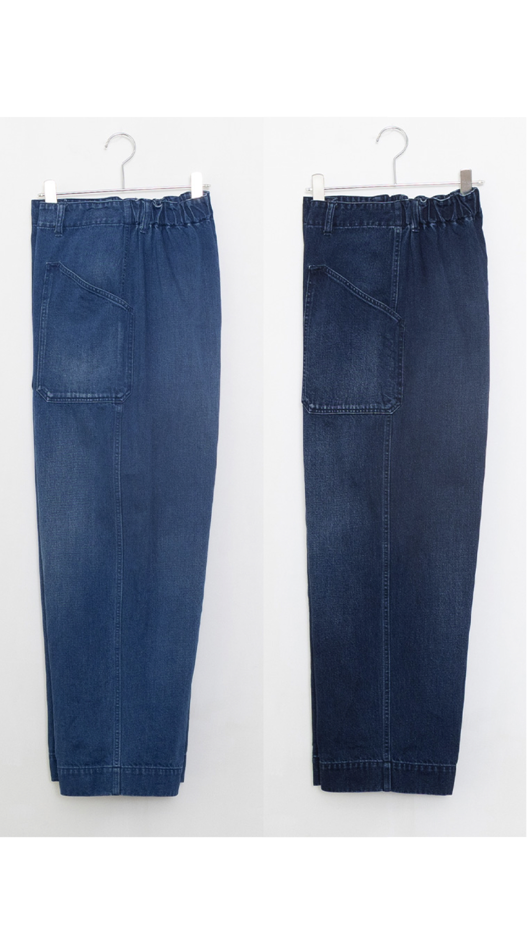 《ヴェリテクール》のデニムユーティリティパンツは、裾に向かって真っ直ぐに落ちるストレートシルエット。ウエストは後ろにのみゴムの入ったイージースタイルで、穿き心地の良さも嬉しい。