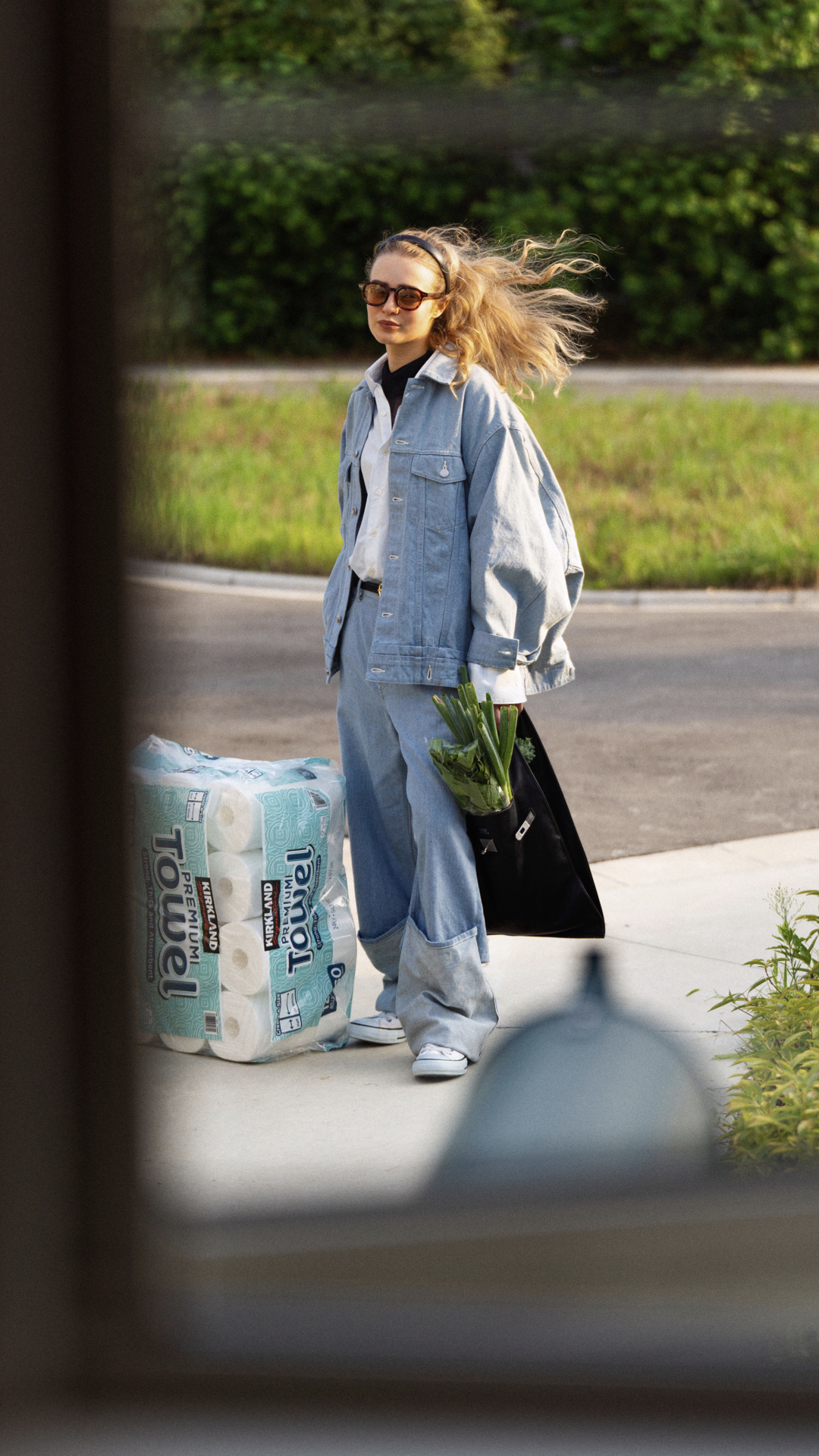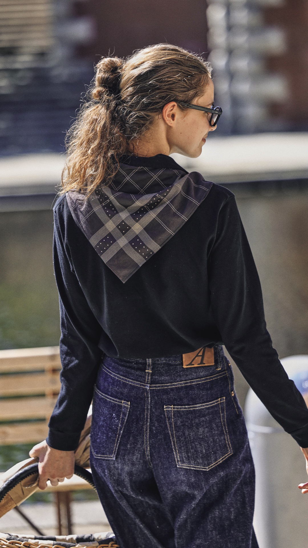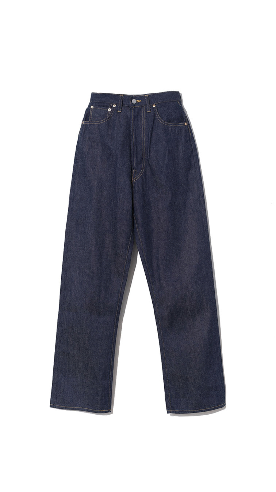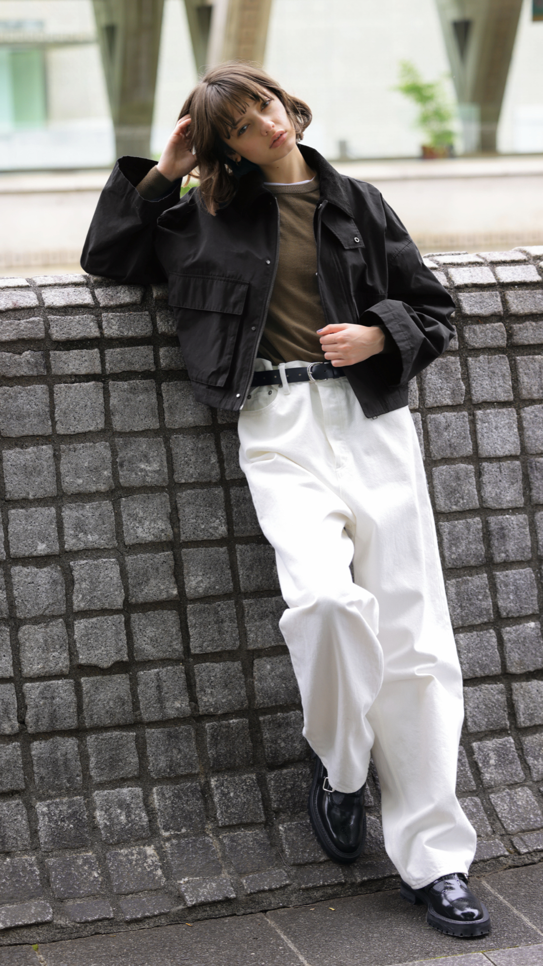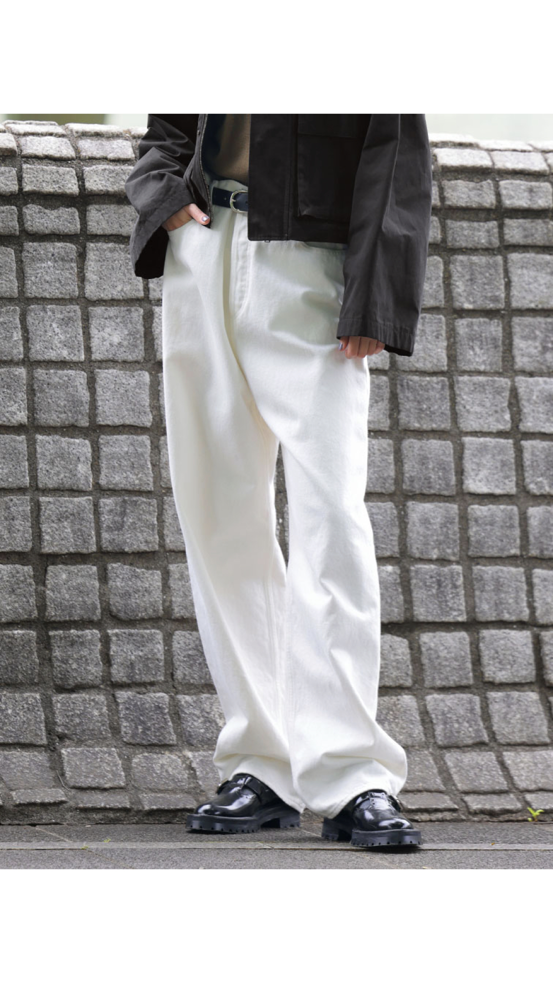 クリーンな印象のホワイトデニムなら、《サクラ》の一本がおすすめ。深めの股上で、ウエストからヒップまでワイドサイズで作り上げ、ベルトで絞って着用することで生まれるニュアンスがポイント。