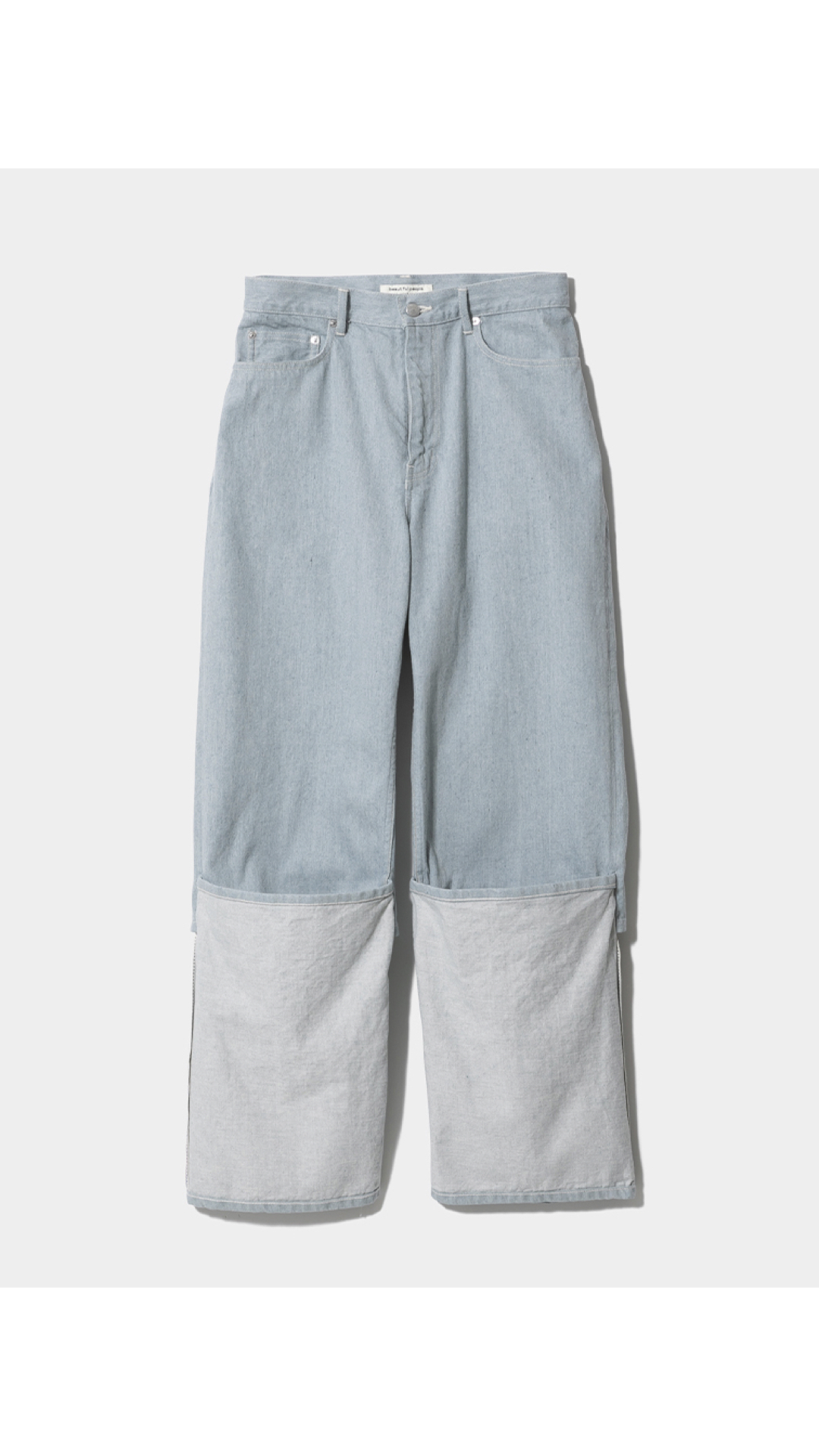 ひざ下の切り替えデザインが特徴の《ビューティフルピープル》の5ポケットデニムパンツは、デニムのリサイクル綿と生成り色の綿を合わせることで生まれる独特のサックスカラーが魅力。