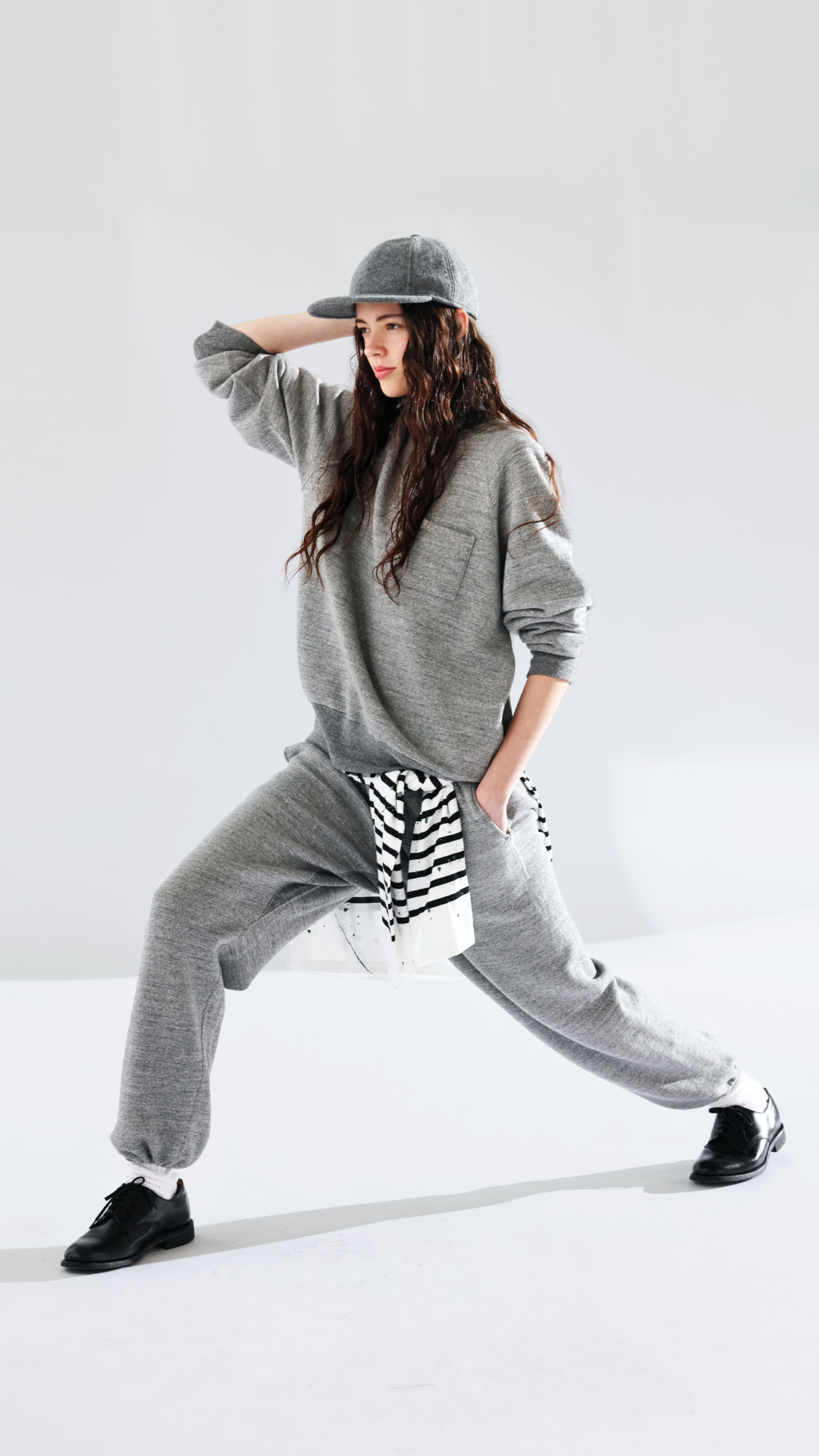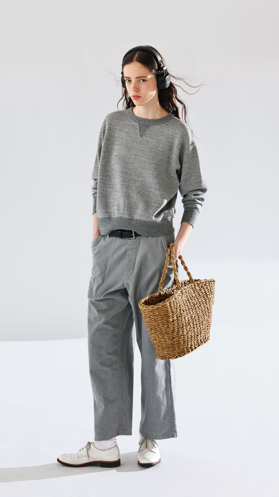 洗練されたグレーとグレーリサイクルコットンと美しい超長綿を組み合わせて生まれた生地のスウェットは、ヴィンテージにあるようなレトロな表情。リサイクル素材による薄手のデニムパンツは、絶妙なメランジェカラーが魅力。