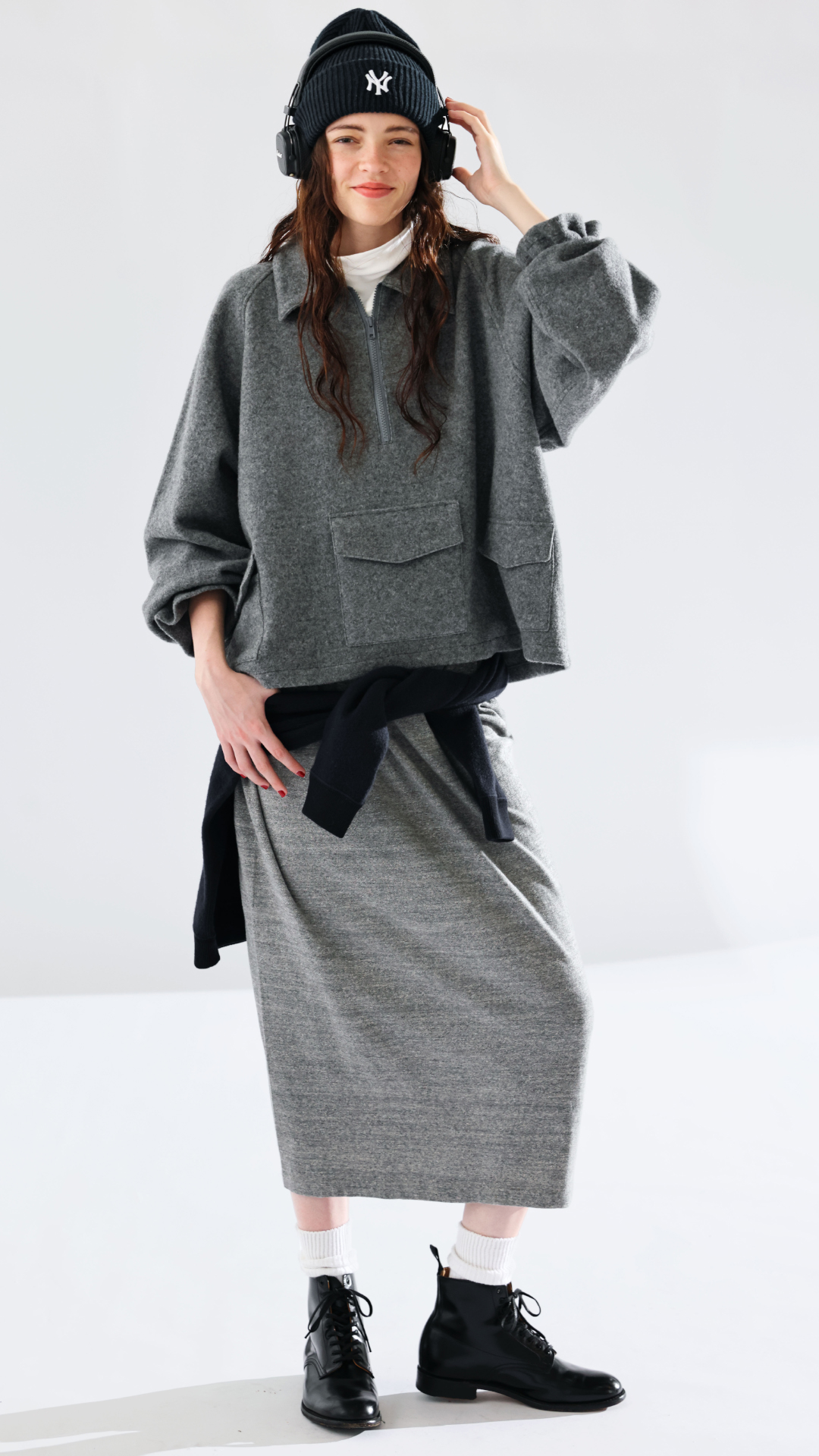 3つの大きなポケットが印象的なプルオーバーは、スポーティでありながらモードな存在感を放つ。そこに合わせるのは、ナチュラルな風合いが魅力のオーガニック素材のスカート。異なる質感の絶妙なバランスが新鮮。
