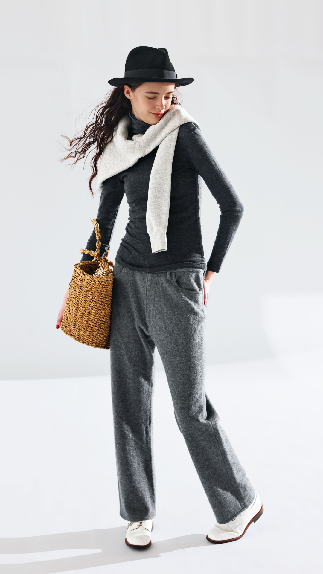 自在な伸縮性で美しくフィットするタートルネックは、インナーにも一枚着にも映える上質な仕立て。秋冬らしい素材感のウールを5ポケットデザインで仕上げたパンツを合わせて。ラフに肩掛けしたスウェットもポイント。
