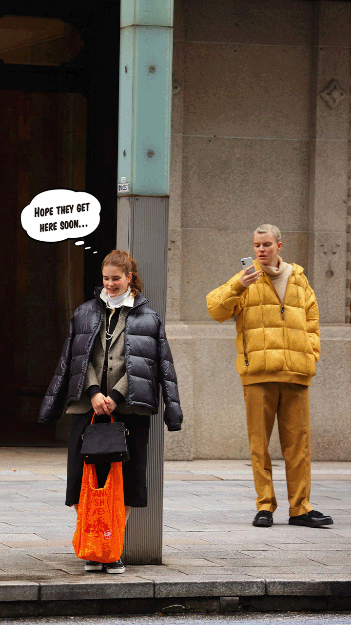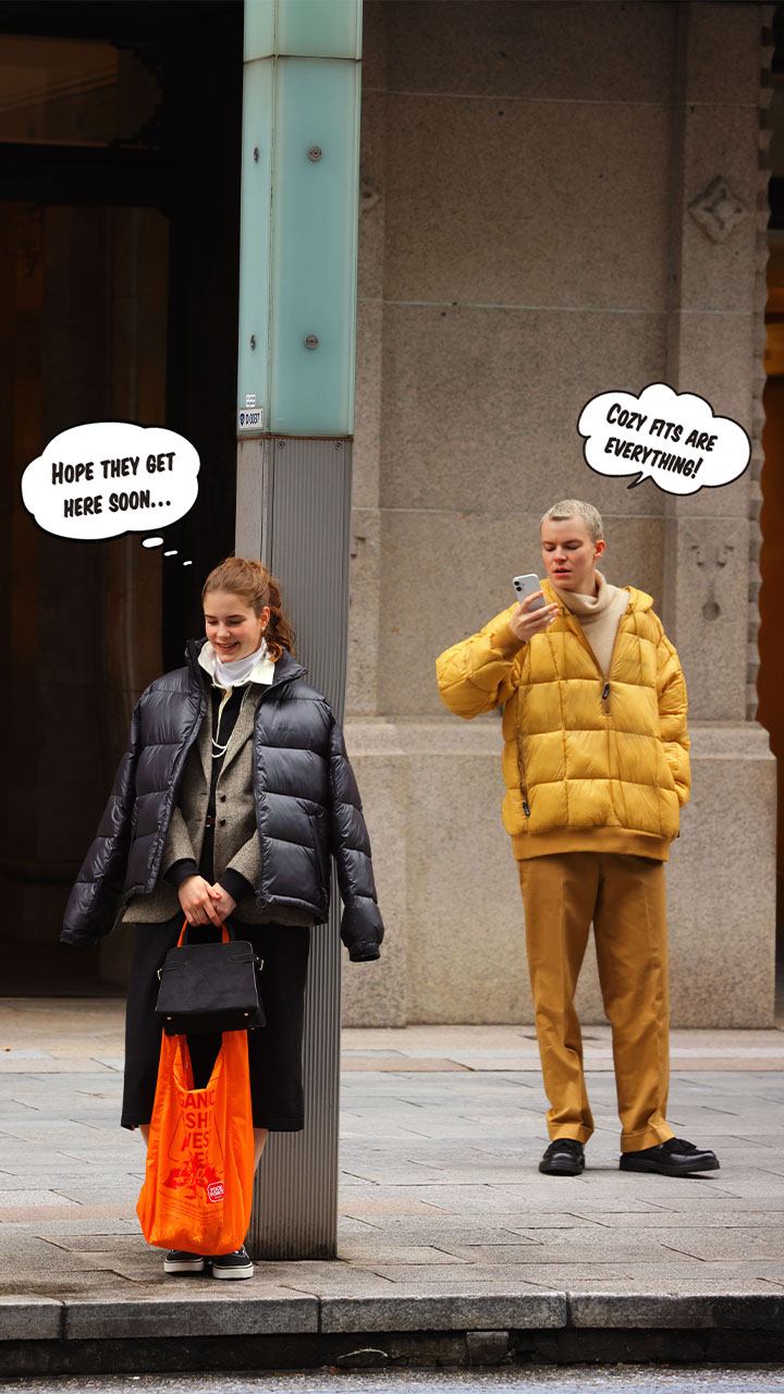 高級感のある光沢が特徴のGEM シリーズから、ボリューム感のあるシルエットが魅力の”ジェムハイロフトジャケット”をピックアップ。ツイードジャケットを羽織ったトラッドスタイルとダウンジャケットの組み合わせで新鮮なムードに。