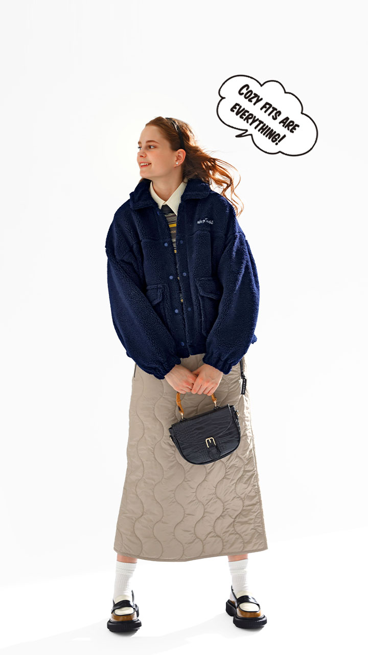 ふわっとしたボア素材を使用したショート丈のG-1ジャケットは、大ぶりな襟とフロントポケットのデザインが印象的。ベージュカラーの波キルトのスカートを合わせて、都会の冬に最適なあったかコーデが完成!