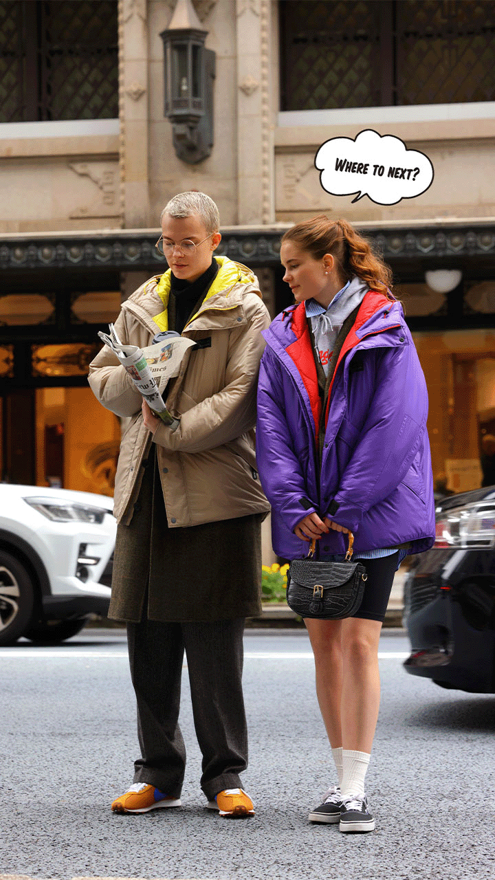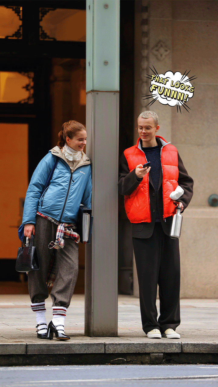 リフレクターロゴを配したソリッドで現代的な面と、復刻のネームタグと波キルトがレトロな面で、異なる2 つの表情が楽しめる“リバーシブルビレイジャケット”。レディな小物と合わせたオフバランスコーデで楽しんで。