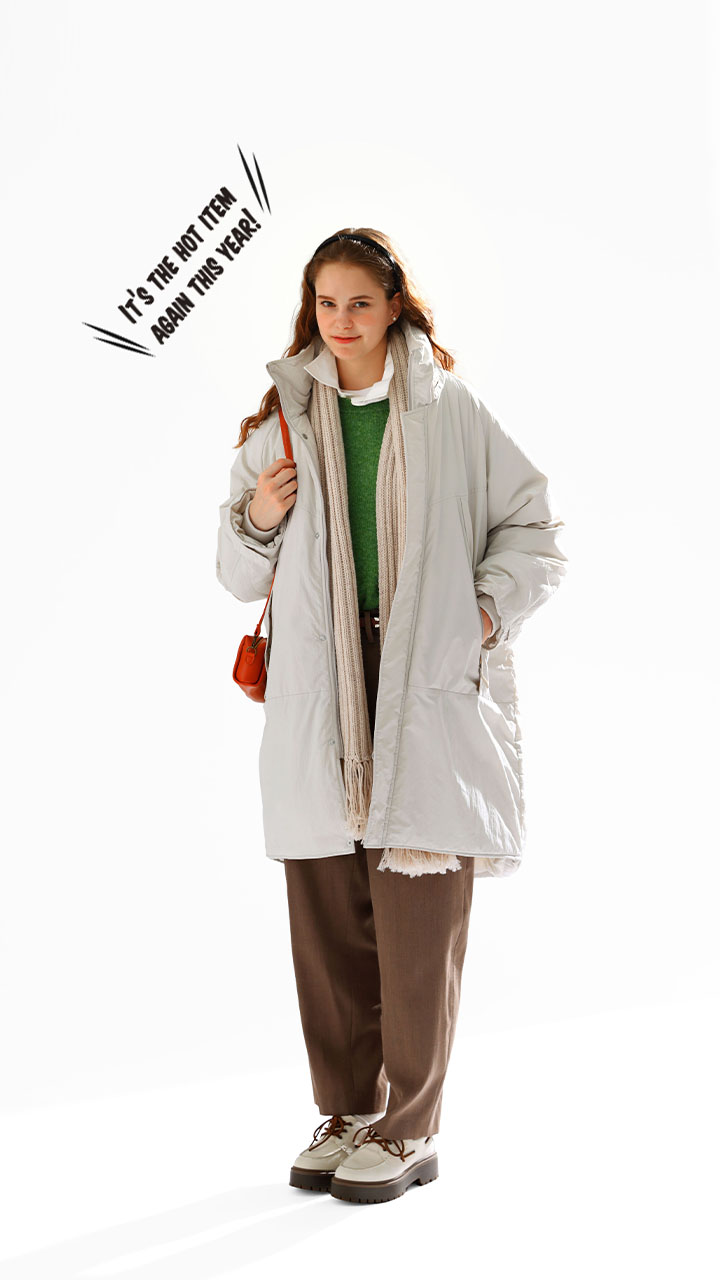 ミリタリーコートを現代的かつ都会的にブラッシュアップした、ブランドのヒットアイテム“モンスターパーカー”。インナーを選ばないオーバーサイズながら、膨らみすぎないすっきりとしたシルエットが人気の理由。