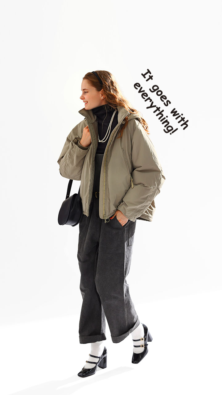フードを格納したスタンドカラーとフロントのハの字ジップが特徴の“ハッピージャケット”もブランドを代表する人気アイテムのひとつ。ウィメンズ仕様にミリタリー感を軽減したデザインが、どんなスタイルにもフィットする。