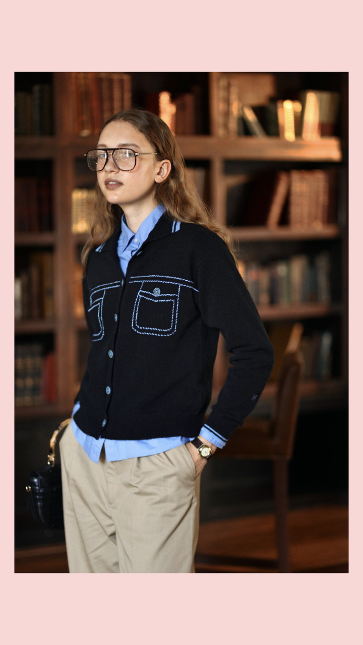 デニムジャケットのディテールをニットで表現した個性的なトップスが主役。ラフなステッチワーク部分は、異なる編み地が立体感をプラスしてくれる。淡いブルーのシャツ、ベーシックなチノパンなどでプレッピーに。