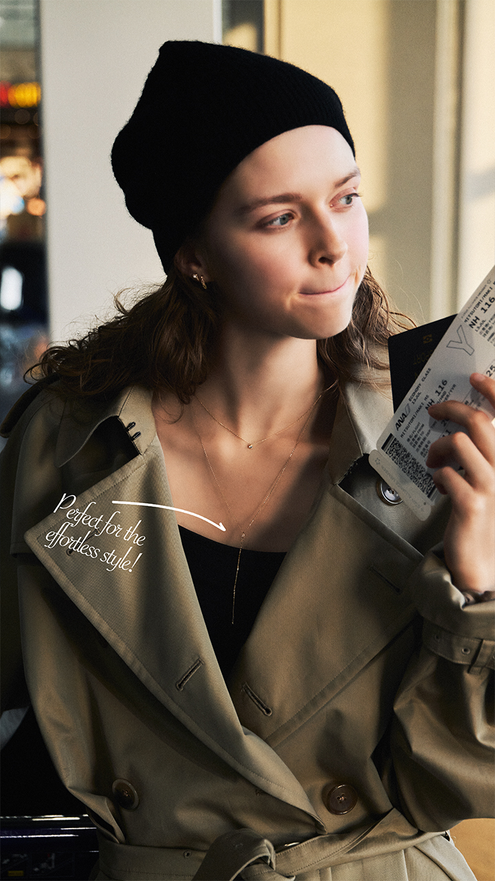 どの角度からも美しく見えるサークルのデザインが光るネックレスに、白蝶貝とレモンクォーツのリバーシブルチャームをセッティング。繊細に光るダイヤモンドピアスを合わせれば、旅慣れた彼女にふさわしい洗練のスタイルが完成。