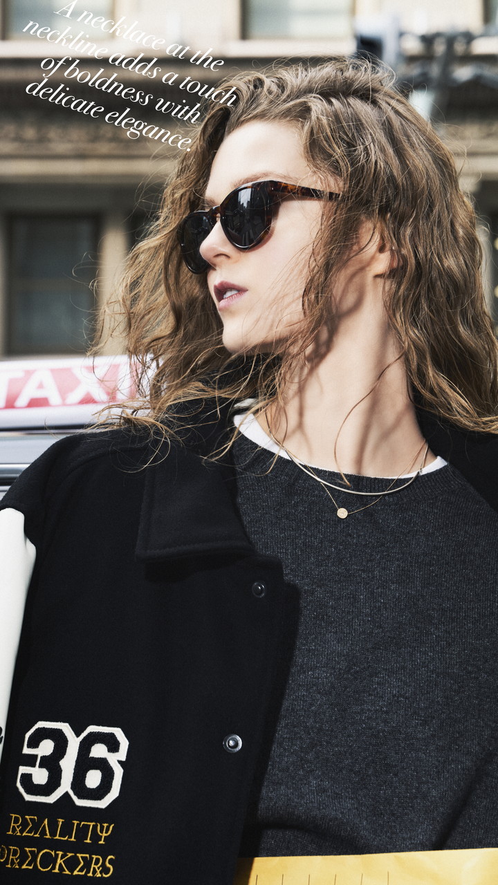 繊細に輝く小ぶりのダイヤモンドをぎゅっと敷き詰めた、贅沢なボリュームのネックレスにシルバーのチョーカーをレイヤード。カジュアル好きなワーキングレディの胸元を華やかかつ知的に彩る、リュクスな余裕を感じさせるスタイル。