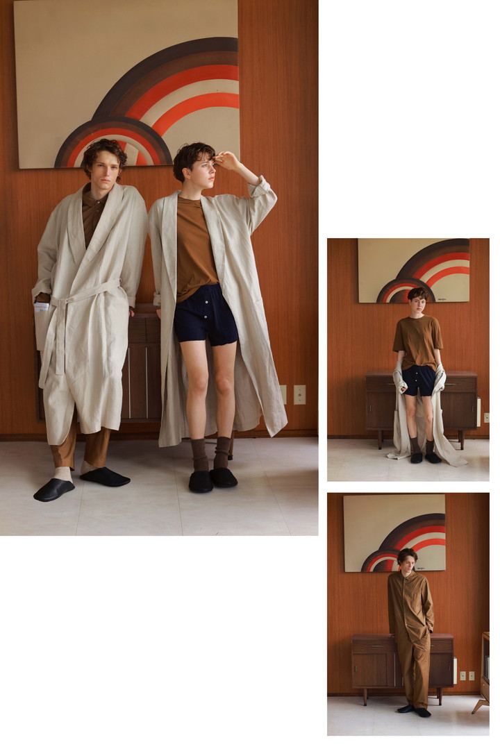ベッドリネンと同じ生地で仕立てられたローブは、テーラードを思わせる端正なショールカラーが、さりげなく優雅な雰囲気を添えてくれる。亜麻本来の色を生かしたローリネンのエクリュは、飾らない佇まいのまま、どこか洗練を感じさせる不思議な色。ボタニカルカラーのインナーとも、美しく響き合う。