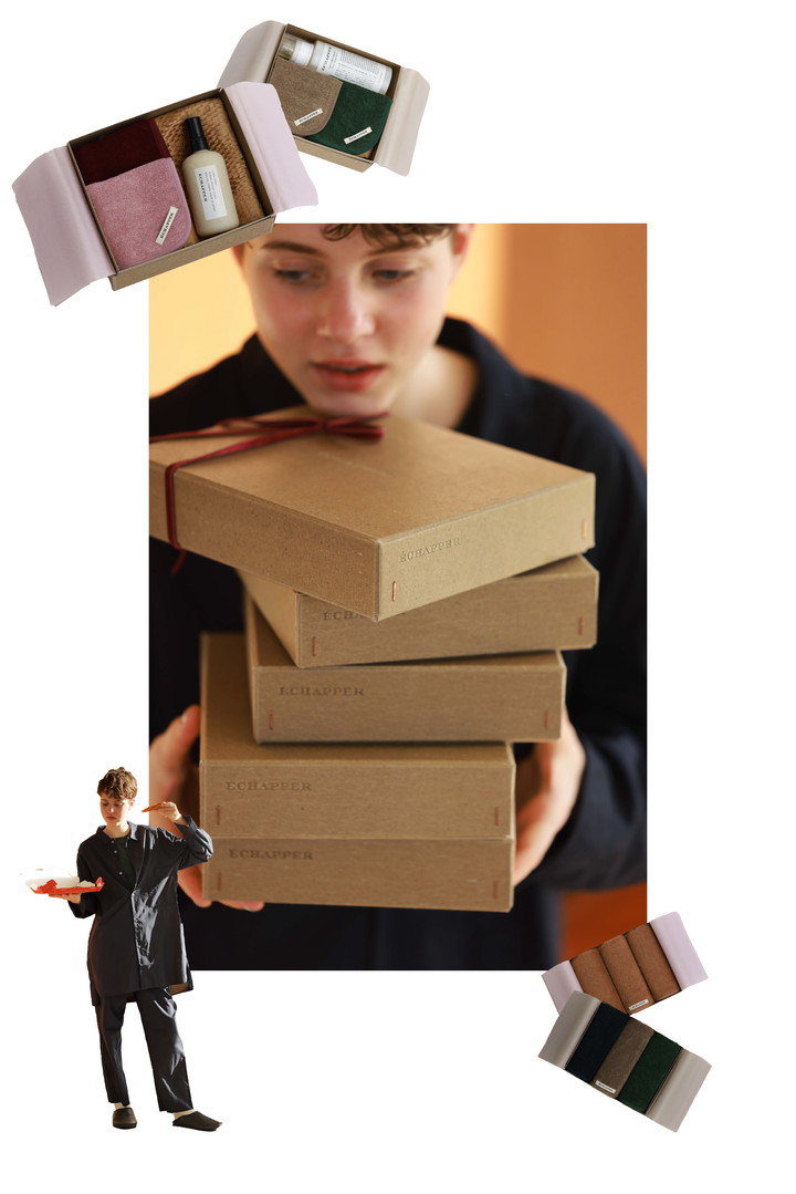 ボタニカルカラーで染色したチーフタオルや、濃淡をつけた小豆色のチーフタオルを、リネンスプレーやランドリーリキッドとセットにしたギフトボックスと、リネンパイルのタオル、コットンミニタオルを3枚ずつセットにしたギフトボックス。それぞれ「クルーエル」だけの限定配色でお届け。