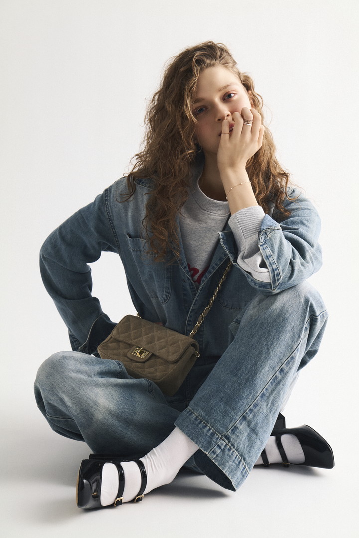デニムのセットアップにグレーのスウェット。彼女の軽やかなウェーブヘアが、フォークロアのムードをさりげなく薫らせる。手元にきらりと寄り添う繊細なリングとブレスレットが、飾りすぎないこなれ感を添えて。自由な気分で楽しむ、新しいデニムスタイル。
