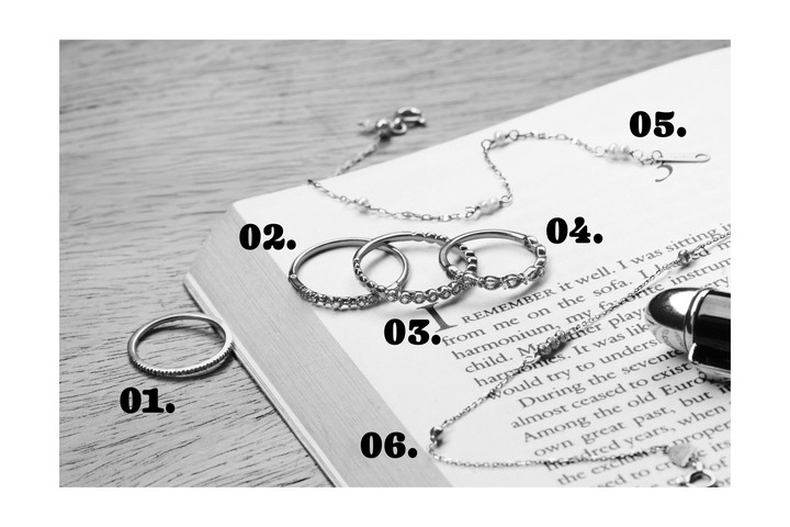 宝石を散りばめたような多石使いのリングと、透かしのデザインが美しいトロワリング。 重ねることで生まれる凛とした佇まいは、ファージャケットにも引けを取らない存在感を放つ。 華やかさと知性が共存する、大人のためのレイヤード。