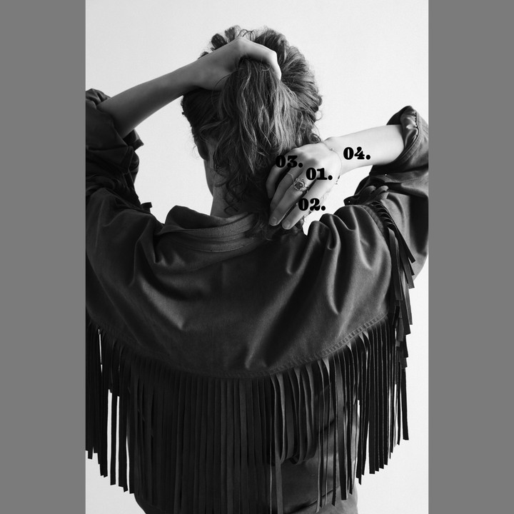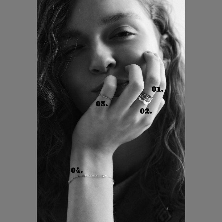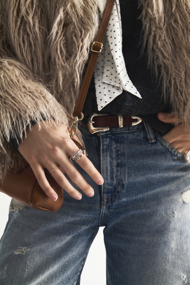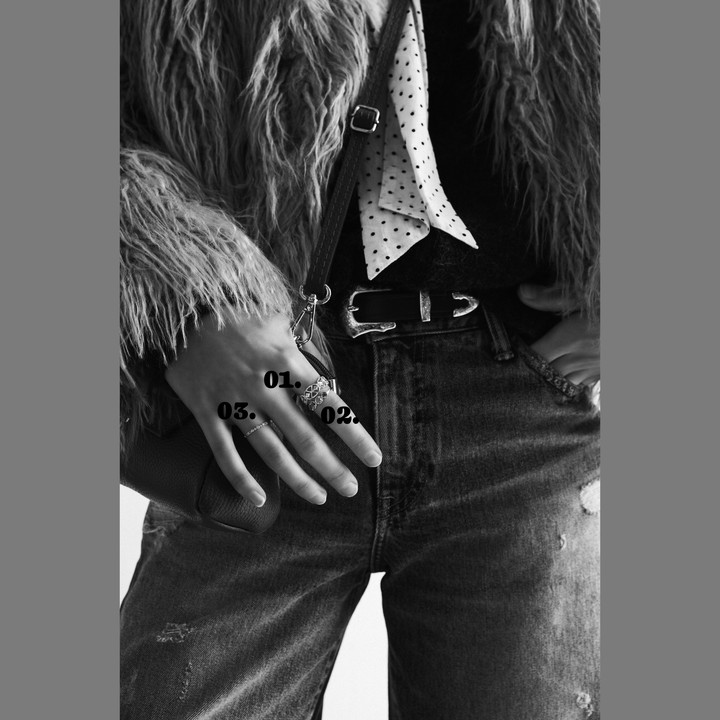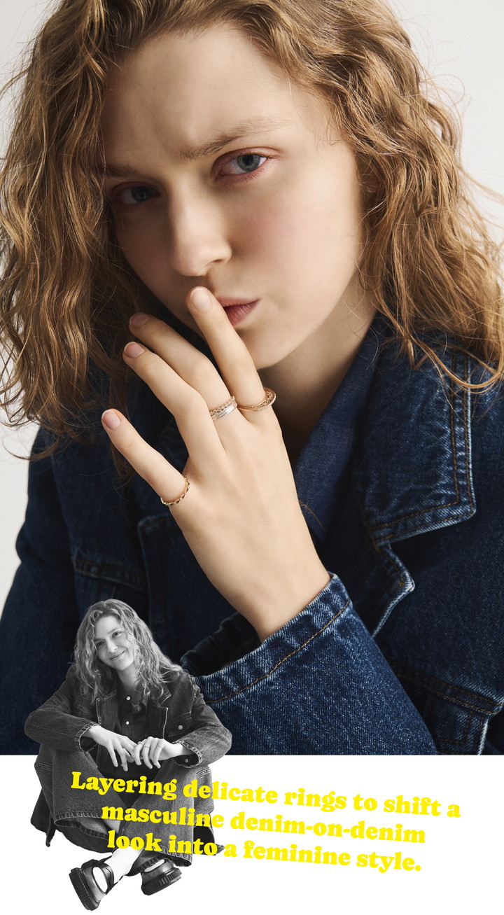 マニッシュなデニムオンデニムを、繊細なリングのレイヤードで女性らしく。 立体的な透かしやフェザーモチーフのディテールが、フォークロアの空気感を上品に引き寄せる。 強さとしなやかさ、そのどちらも大切にしたい日に。