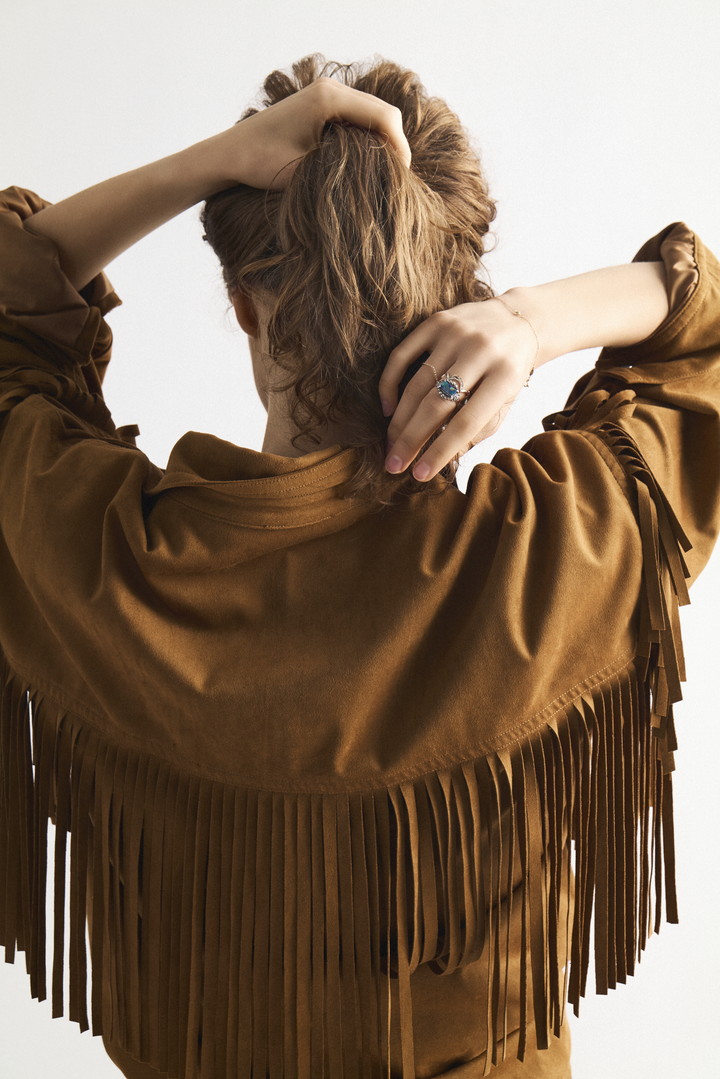 フリンジの効いたシャツにブルーデニム。王道のフォークロアスタイルの中で、ひときわ目を惹くブルーストーンのリングが印象を引き締める。 ボリュームのある色石も、デニムと合わせれば自然体。手元から、スタイルに深みを与えて。