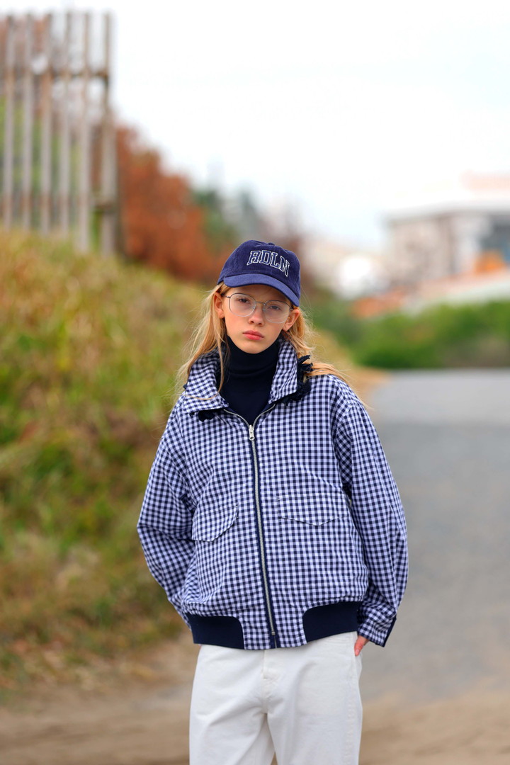 ギンガムチェックのブルゾンは少し甘くて安心する。そして襟にこっそりお花のコサージュを付けるのが、バッドな気分の日のお守りがわり。白いパンツとスニーカーで、曇り空の朝でも気分は軽め。