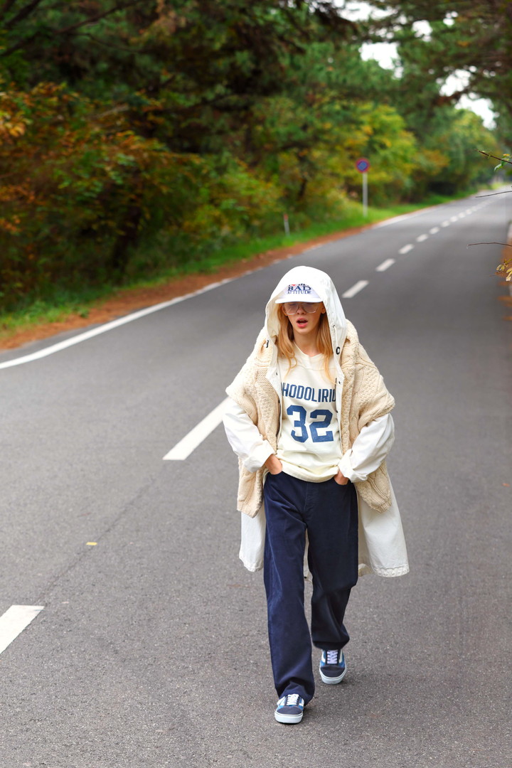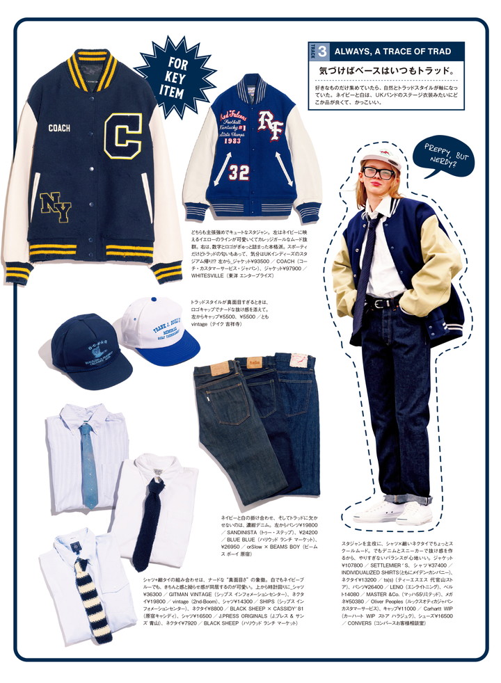 好きなものだけ集めていたら、自然とトラッドスタイルが軸になっていた。ネイビーと白は、UKバンドのステージ衣装みたいにどこか品が良くて、かっこいい。
