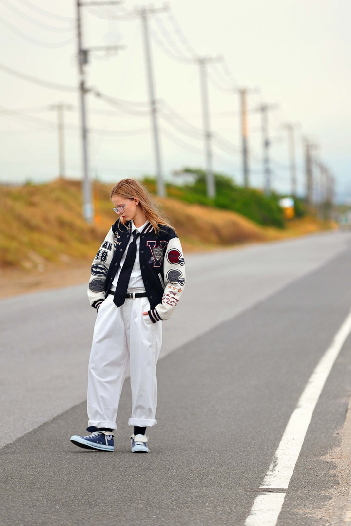 スタジャンは少し派手なくらいが気分を上げてくれる。胸も袖も背中もワッペンだらけで、歩くたびに少し勇気が出る。細いネイビーのタイは、真面目なふりの小道具。クールに着こなすよりも、派手に鳴らす方がいい。