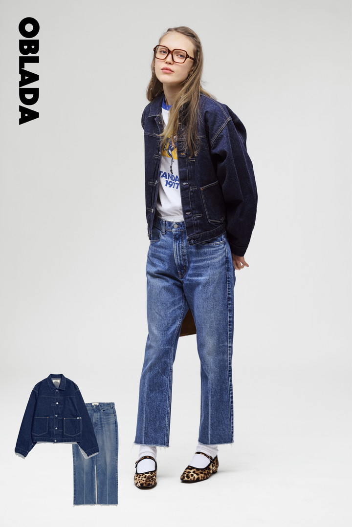 デニム本来の風合いを活かしながら、都会的にアップデートされた《オブラダ》のデニムアイテムは、どんなスタイルとも好相性。トリムTシャツやレオパード柄のシューズなど、個性的なアイテムを自然体にまとめつつ、日常の装いをモードへと導いてくれる。