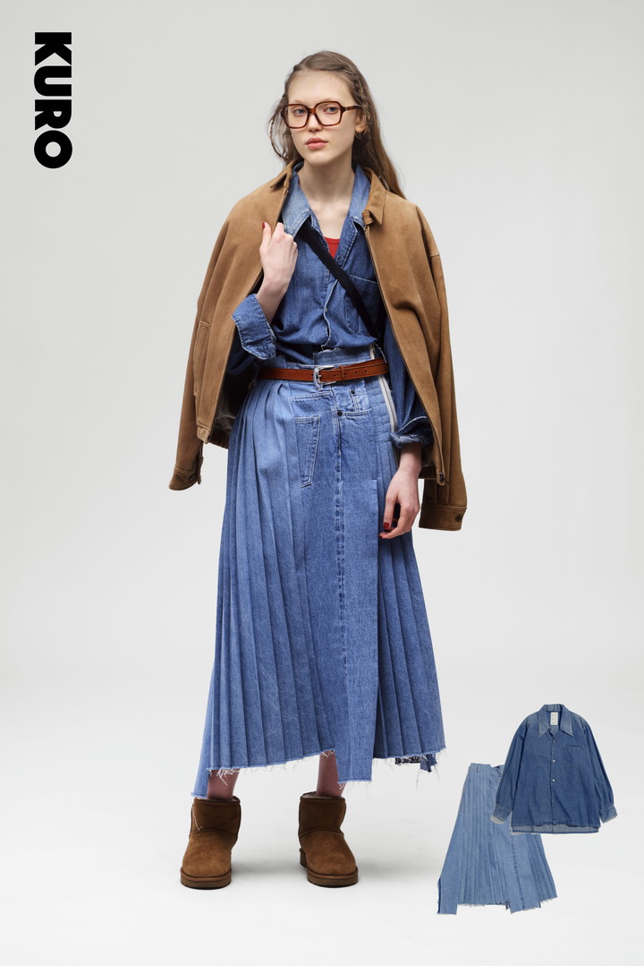 《クロ》らしいスカートが主役のデニムスタイル。70s を代表するフォークロアな要素をミックスして、甘さを抑えたスタイリッシュな着こなしに。