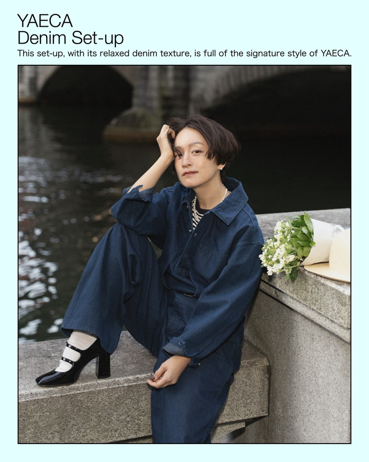 リラックスして着ることのできるデニムの風合いが、《ヤエカ》らしさ溢れるセットアップ。ミリタリーライクなディテールはデイリーに活躍する実用性も兼ね備えている。プルオーバーのスモックシャツはアメリカの陸軍で使われていた作業着がモチーフなんだとか。