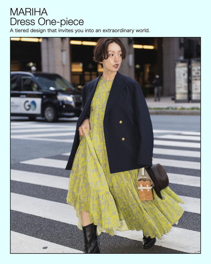 たっぷりとしたボリュームと足元まで広がるティアードが、非日常へと誘う一着。あえて紺ブレやウエスタンブーツと合わせて、甘さにエッジを効かせたい。仕上げに同ブランドのアクセサリー添えて。さりげなく主張する大人のためのジュエリーを。