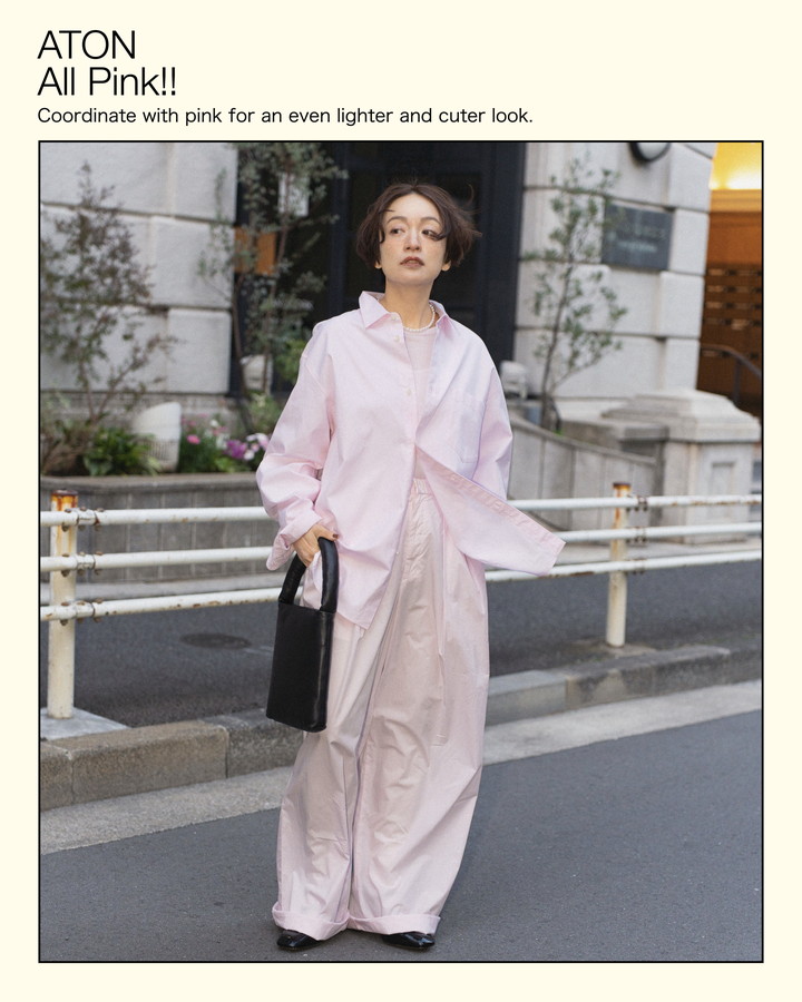 滑らかでとっても軽い、《エイトン》オリジナルのローン素材を使ったシャツとパンツ。ピンクで統一してさらに軽やかに、 可愛く着こなして。 抜け感のあるシャツの着こなしと、とことんシンプルなコーディネートが肝!!大人の女性はシンプルな着こなしで良いのです♡