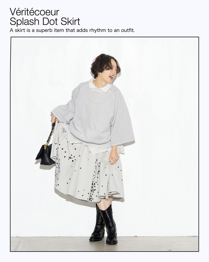 不規則なスプラッシュドットをあしらったスカートは、コーディネートにリズムを生み出してくれる逸品。明るくもニュアンスのあるトーンで統一して、《ヴェリテクール》の世界観をたっぷり表現してみて。 バッグとシューズは黒のレザーで統一してお出掛けスタイルに。