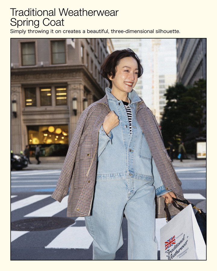 ブランドらしいガンクラブチェックを纏ったスプリングコート。丁寧に織り上げたハリのあるコットンツイルを使用し、軽く羽織るだけで立体的な美しいシルエットが生まれる。デニムオンデニムで合わせて、春らしく爽やかなに着こなしたい。