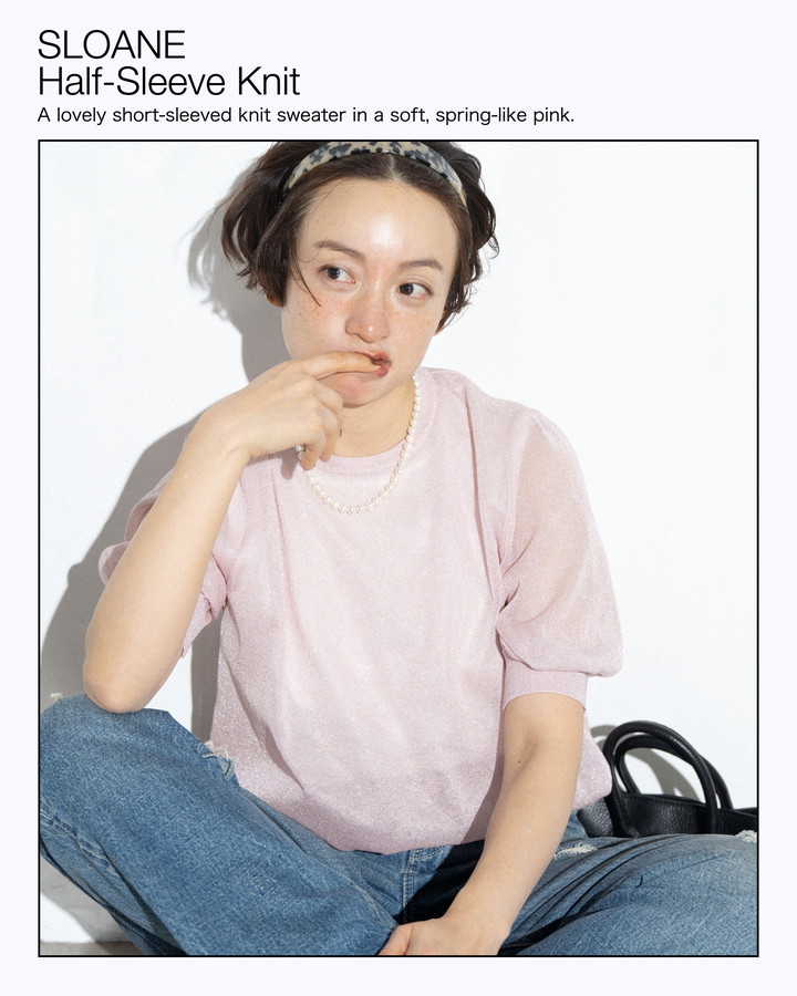 春らしい柔らかなピンクが愛らしい半袖ニット。表にはソフトな肌触りのラメ糸、 裏にはオーガニックコットン×リサイクルポリエステルの混紡糸で、 着心地は抜群。シアーな質感で、夏まで楽しめるのも嬉しいポイント。