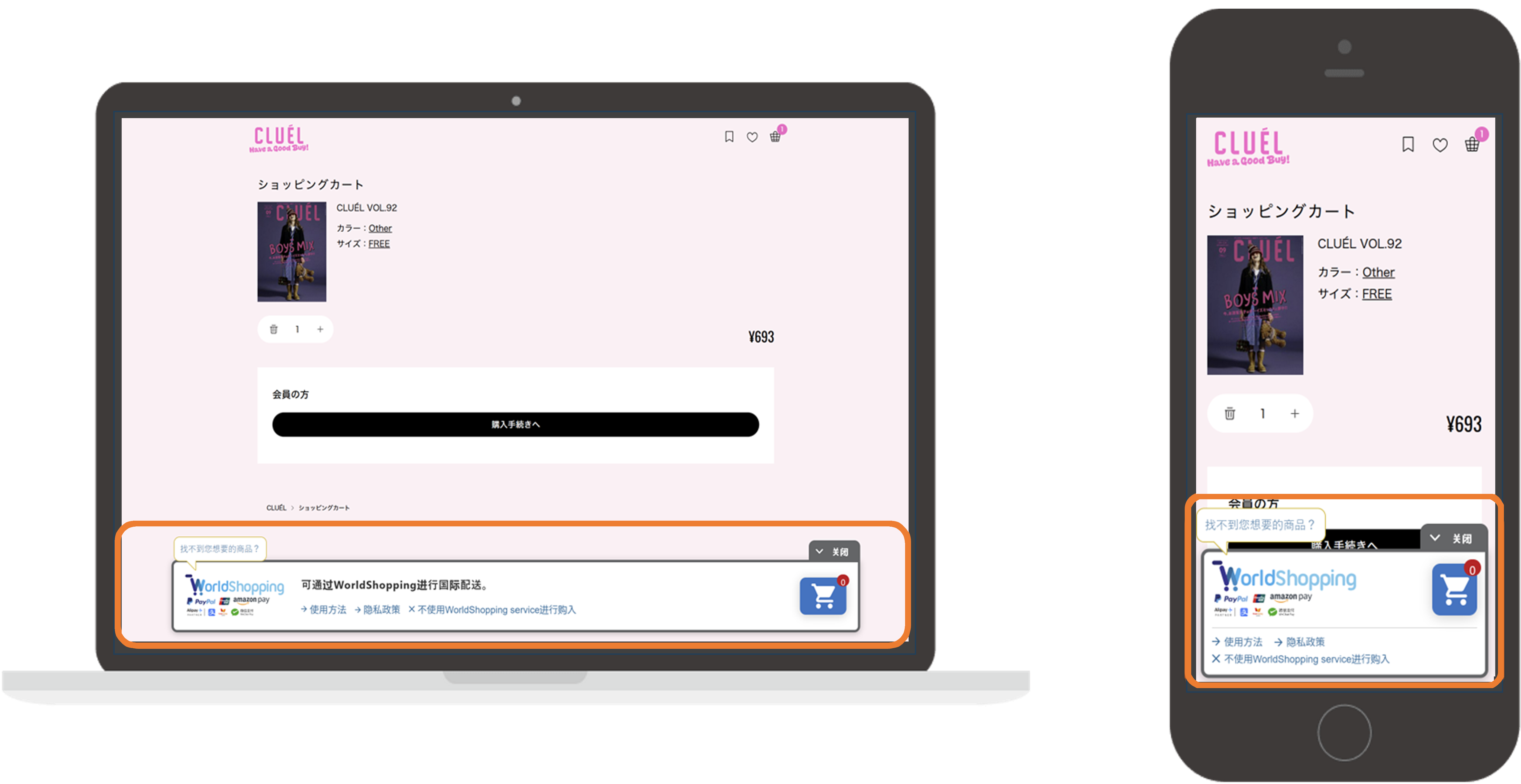点击“添加到购物车”的“WorldShopping旗帜广告,只有在您国家可以购买的商品才会出现在购物车中,继续购买您喜欢的商品。