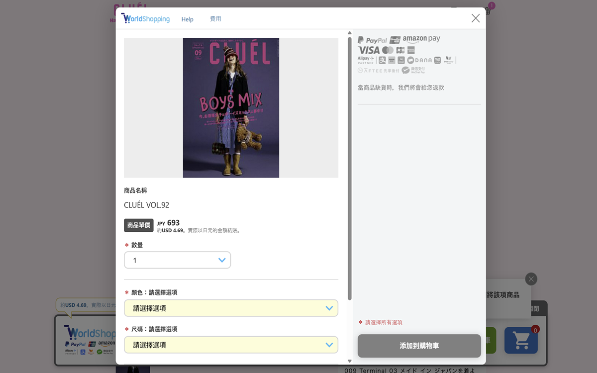2. 將您喜歡的商品添加到購物車中。 點擊 “添加到購物車”的“WorldShopping旗幟廣告,只有在您國家可以購買的商品才會出現在購物車中,繼續購買您喜歡的商品。 →探索 WorldShopping Guide 指南,了解更多詳情。