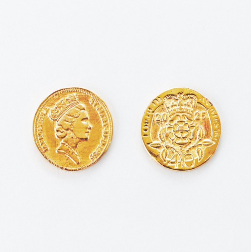 サドルに挟まれたコインには、表面にエリザベスⅡ世の肖像とブランドロゴ、裏面にチューダーローズと王冠、そして“2025”と“40”の数字が刻まれている。歩くたびにきらりと輝き、足元に洗練された印象を添えてくれる。