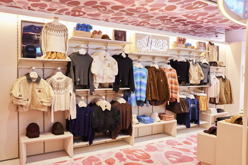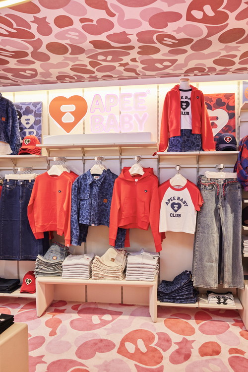 Z世代のガールズに向けたウィメンズラインを取り扱う《エイピー》が、原宿に旗艦店を初オープン。ブランドの象徴であるピンクのハートカモフラージュ柄が、床から天井までびっしりと散りばめられ、どこを切り取っても可愛い店内になっている。